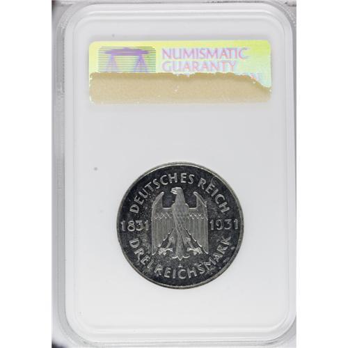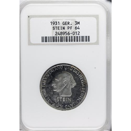 <B>Weimar Republic 3 Mark 1931A Von Stein, </B></I>KM73, Proof 64 NGC, slightly uneven toning but attractive with a nice cameo bust.<BR><BR><b>Shipping:</b> Coins & Currency (<a target="_blank" href="http://www.heritageauctions.com/common/shipping.php">view shipping information</a>)