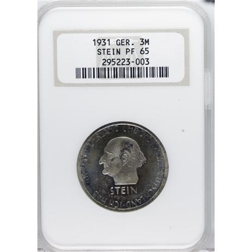 <B>Weimar Republic 3 Mark 1931A Von Stein, </B></I>KM73, Proof 65 NGC, deep mirror surfaces with a cameo bust and some emerging toning.<BR><BR><b>Shipping:</b> Coins & Currency (<a target="_blank" href="http://www.heritageauctions.com/common/shipping.php">view shipping information</a>)