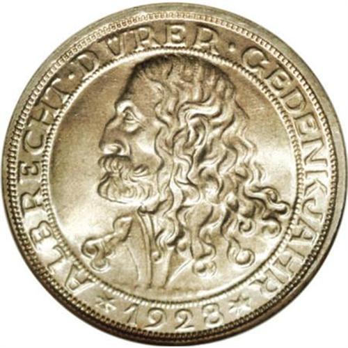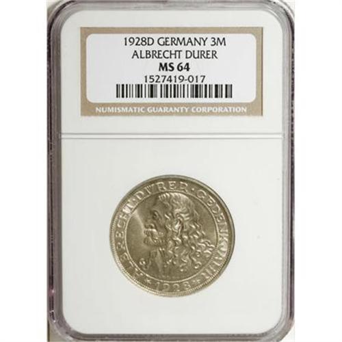 <B>Weimar Republic. 3 Reichsmark 1928-D,</B></I> Durer, KM-58, MS64 NGC, silvery white luster, hint of gold tone, nice and choice.<BR><BR><b>Shipping:</b> Coins & Currency (<a target="_blank" href="http://www.heritageauctions.com/common/shipping.php">view shipping information</a>)