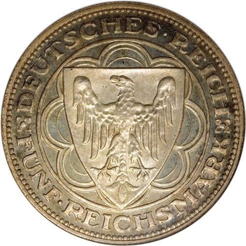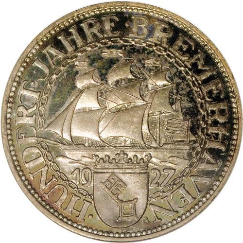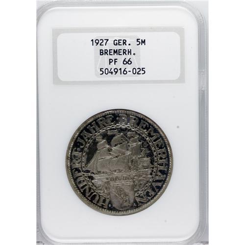 <B>Weimar Republic 5 Mark 1927A Bremerhaven, </B></I>KM51, Proof 66 NGC, a choice example with pastel pink, blue and yellow toning. Rarely seen as a Gem Proof.<BR><BR><b>Shipping:</b> Coins & Currency (<a target="_blank" href="http://www.heritageauctions.com/common/shipping.php">view shipping information</a>)