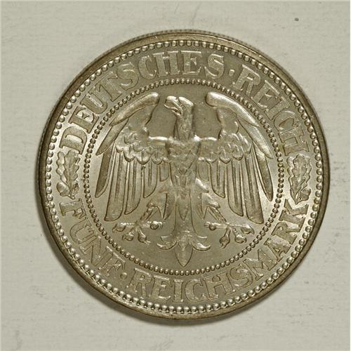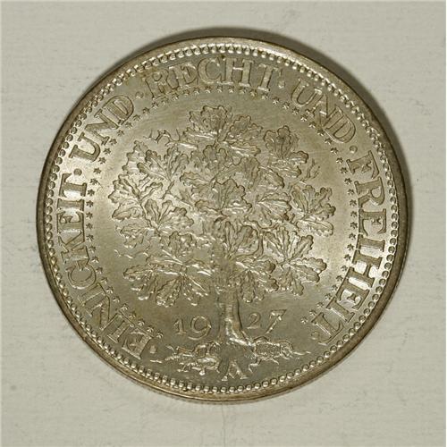 <B>Weimar Republic 5 Mark 1927A Oak Tree, </B></I>KM56, nice brilliant UNC.<BR><BR><b>Shipping:</b> Coins & Currency (<a target="_blank" href="http://www.heritageauctions.com/common/shipping.php">view shipping information</a>)