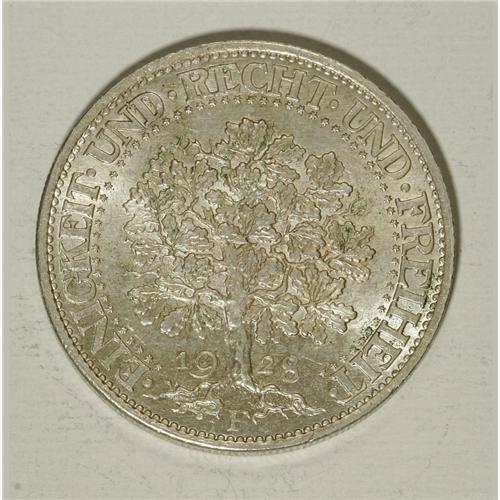<B>Weimar Republic 5 Mark 1928F Oak Tree, </B></I>KM56, choice brilliant UNC, very attractive, scarce mint/date.<BR><BR><b>Shipping:</b> Coins & Currency (<a target="_blank" href="http://www.heritageauctions.com/common/shipping.php">view shipping information</a>)