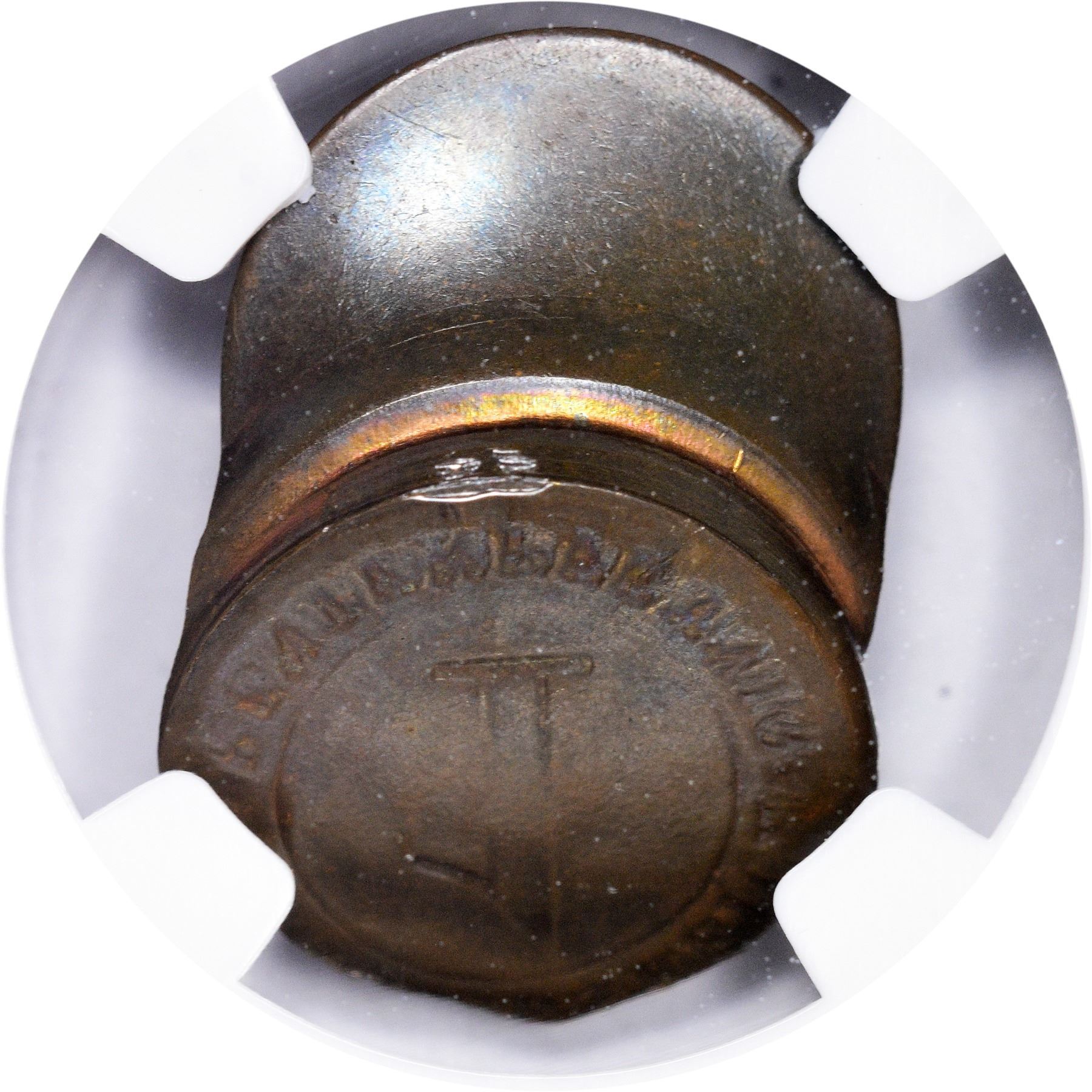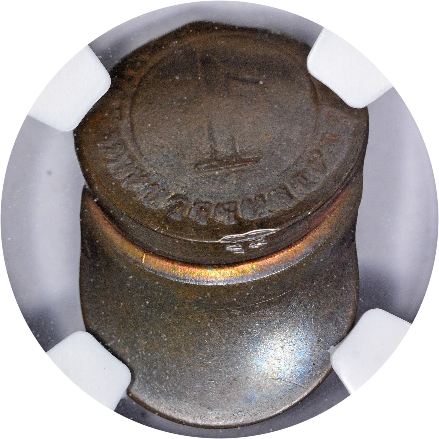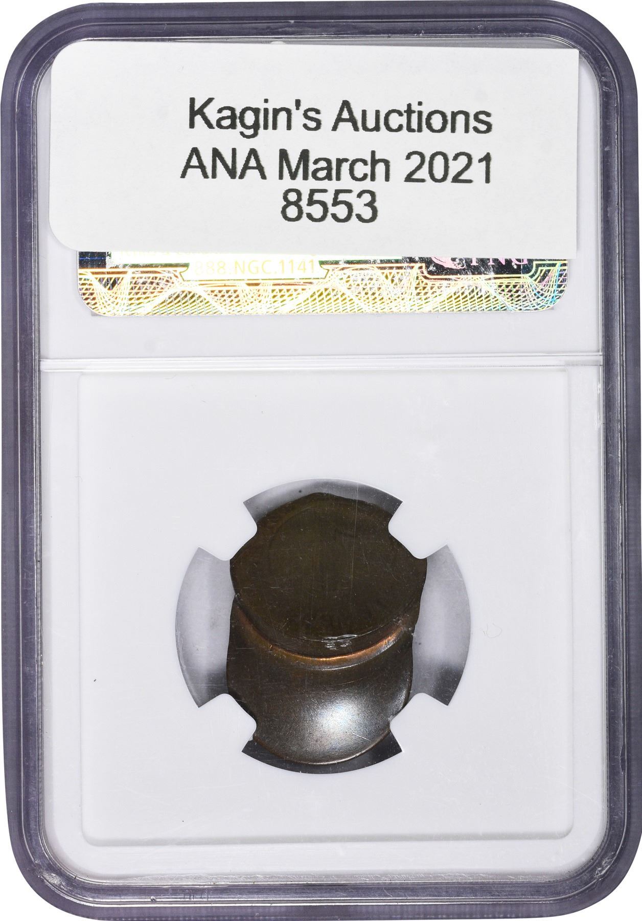 Description: An amazing coin to see and to describe. The surfaces are deep golden-tan with traces of mint orange here and there and a plenitude of luster as well. Struck multiple times peripherally, but just once at the center. The die cap is a bill-like extension of the planchet nearly one-half inch in length, and the reverse is a softened reverse image of the obverse.