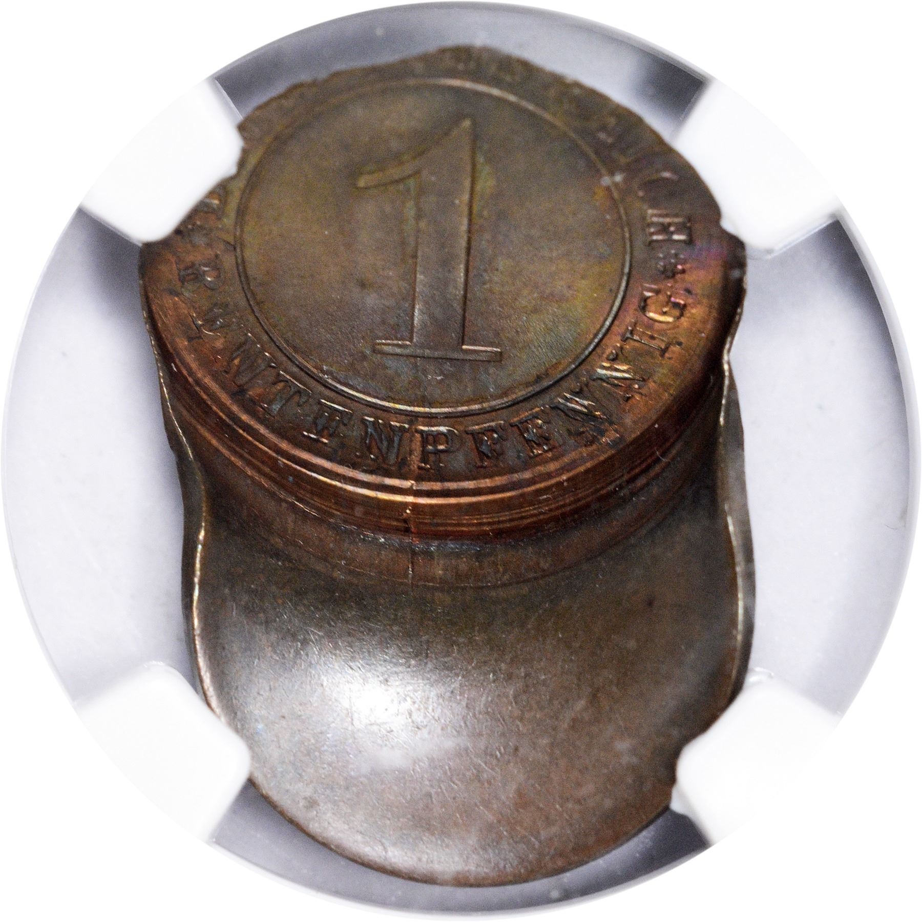 Title: Germany. Weimar Republic. Circa 1926-1936 1 Pfennig. Off-Center Reverse Brockage Die Cap. MS-67 BN NGC.