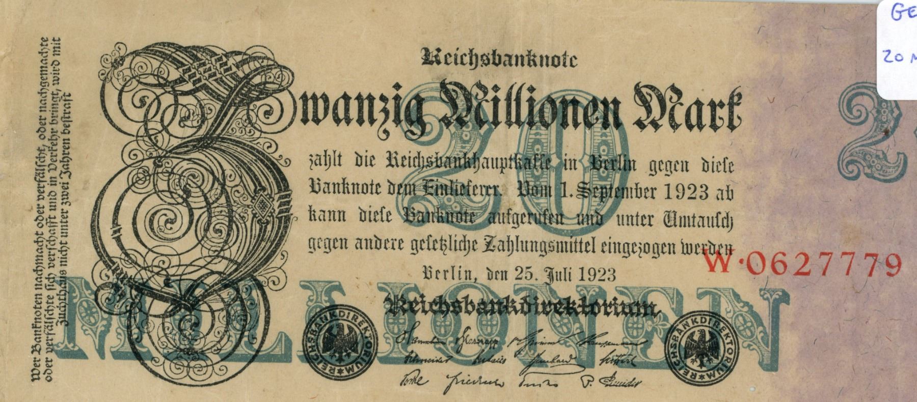 Germany. (Weimar Republic). July 25, 1923 20 Million Mark. Inflationary Note. VF-20.