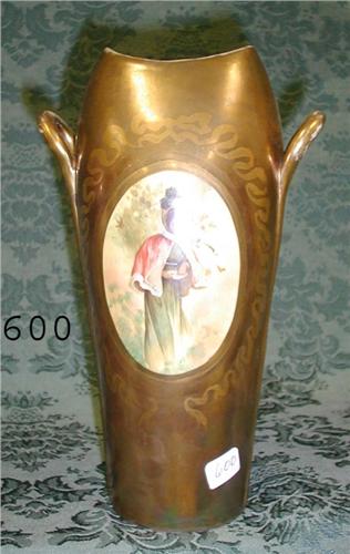 Germany gold Tiffany finish loop handle 8 ¾” vase with portrait of a Victorian lady in a bonnet with a bowl.