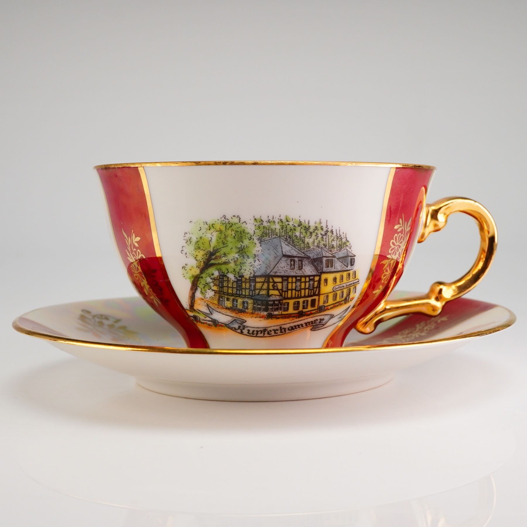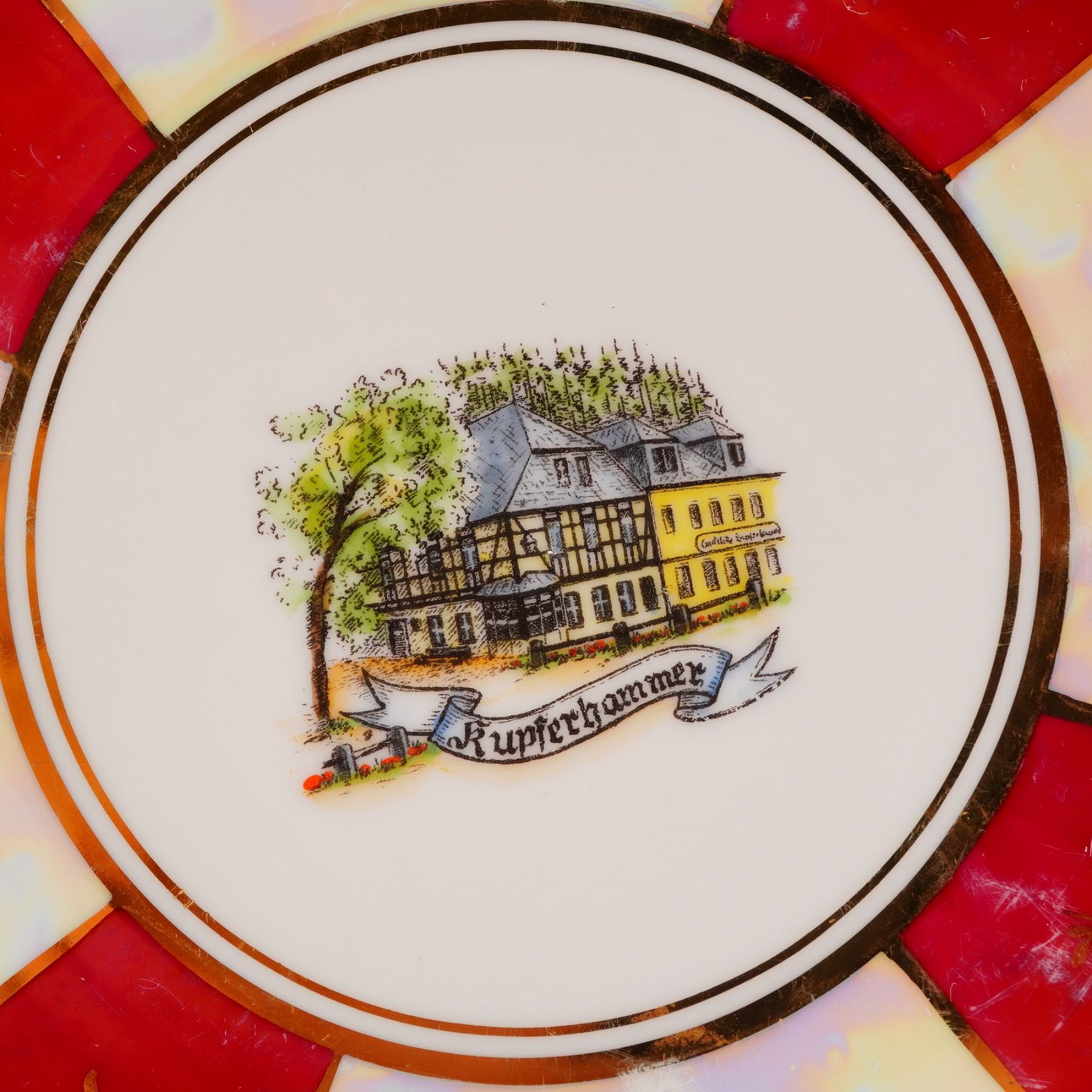 This is a 3pc set, Cup, Saucer & Dessert Plate, has a white porcelain body decorated with alternating panels of deep red enamel and an iridescent luster glaze. Extensive gilt detailing is present, including stylized gold floral motifs within the luster sections and heavy gilding applied to the rims and the cup handle. The central decoration on all three pieces is a colorful transfer print depicting the half-timbered guesthouse complex labeled Gaststatte Kupferhammer. The underside of the plate bears a blue underglaze manufacturers mark reading GEROLD PORZELLAN BAVARIA beneath a crowned crest. Measurement is for largest item.