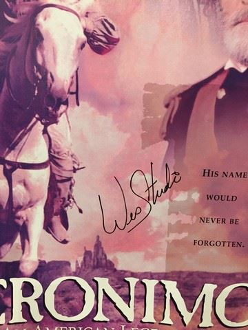 Geronimo An American Legend (1993) cardboard movie poster signed by Wes Studi "Geronimo". Slightly curled in some areas and worn. (40"x27")