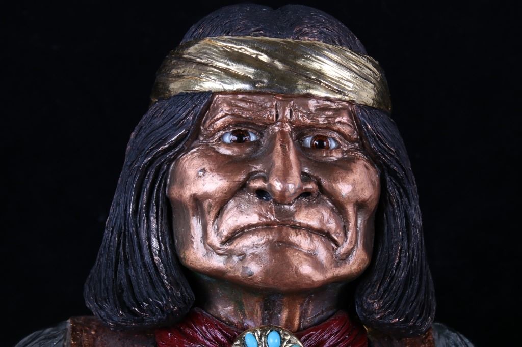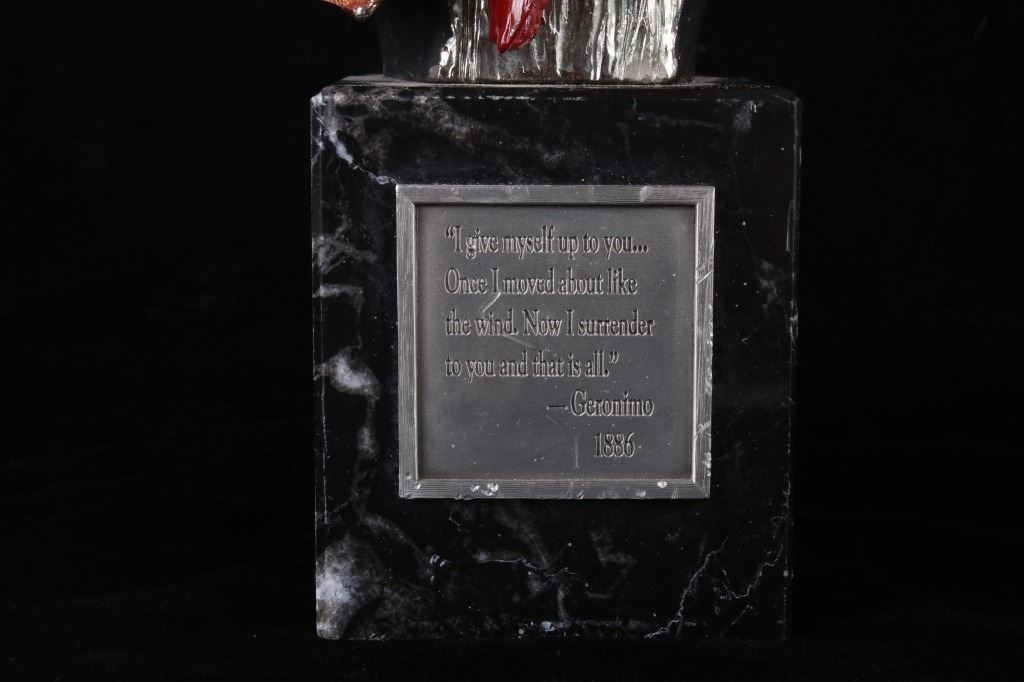 For your bidding pleasure is this "Geronimo" Chilmark Sculpture S. Lockbower. Geronimo means "the one who yawns," he lived from June 1829- February 1909 and was a prominent leader and medicine man apart of the Bedonkohe band of the Apache tribe. While well known, Geronimo was not a chief among the Chiricahua or the Bedonkohe band. However, since he was a superb leader in raiding and warfare he frequently led large numbers of men and women beyond his own following. During Geronimo's final period of conflict from 1876 to 1886 he "surrendered" three times and accepted life on the Apache reservations in Arizona. This bust is in good display condition; and is made from fine pewter as stamped on the lower back of the bust. Also stamped is "Chilmark" and its hallmark symbol along with the artists name and date, SLockbower and 1992. This bust is numbered 381/750. Showing exquisite detail to the face of Geronimo, along with lovely texture and coloring to the vest and adornment around the neck of the Native American Leader set atop of a black and shadowed marble base. There is a quote from Geronimo inscribed to the face of the base, " I give myself up to you... Once I, moved about like the wind. Now I surrender to you and that is all." The measurements of the statue are 12 1/2" x 6" x 4 1/8".
