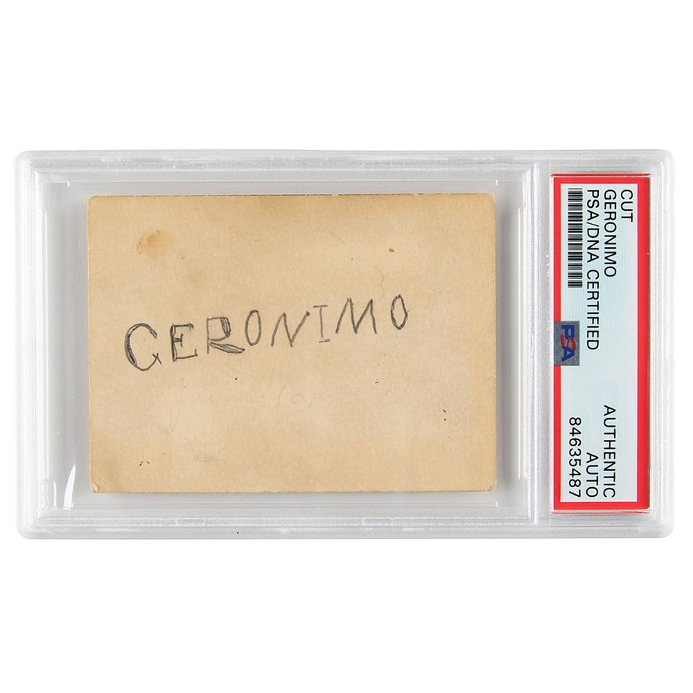 Rare pencil signature, "GERONIMO,†on an off-white 3.25 x 2.5 card. In very good to fine condition, with light soiling, and old mounting residue and stains on the reverse, which also bears pencil notations, "9/1904, St. Louis World Fair." Encapsulated in a PSA/DNA authentication holder.