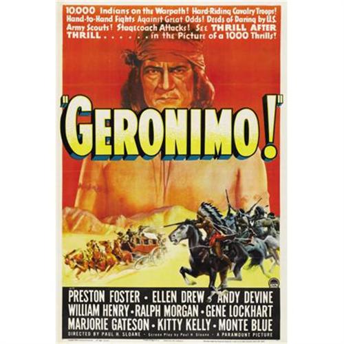 <B>Geronimo (Paramount, 1939).</B></I> One Sheet (27" X 41"). The poster for this classic film is highly coveted by Western collectors because of the iconic imagery of the great Native American leader, as well as other great elements such as a stagecoach and a band of marauders. The story involves the efforts of the U.S. Army to stop Geronimo (Chief Thundercloud) from attacking the white settlers. General Steele (Ralph Morgan) is appointed to the task by President Grant. This gorgeous poster has only minor flaws, including pinholes, minor edge wear with tiny chips, and minor fold separation, all held at bay by older restoration. Very Fine on Linen. <BR><BR><b>Shipping:</b> Rolled Material (<a target="_blank" href="http://www.heritageauctions.com/common/shipping.php">view shipping information</a>)
