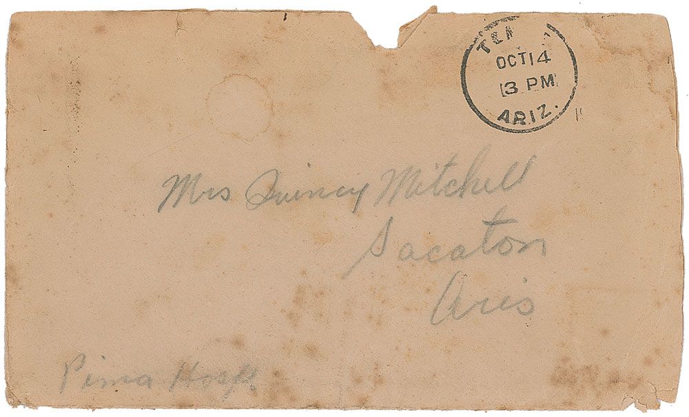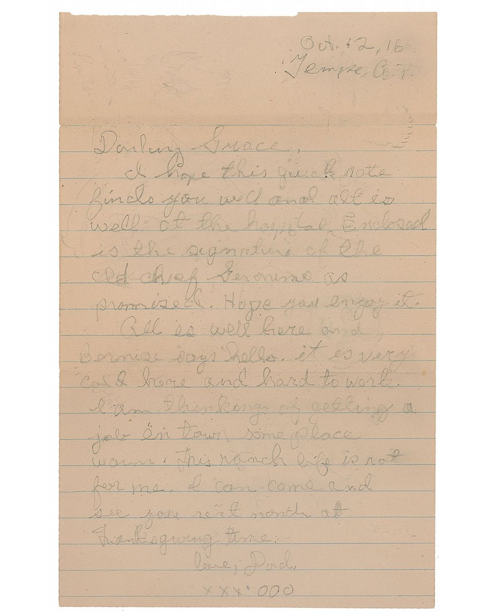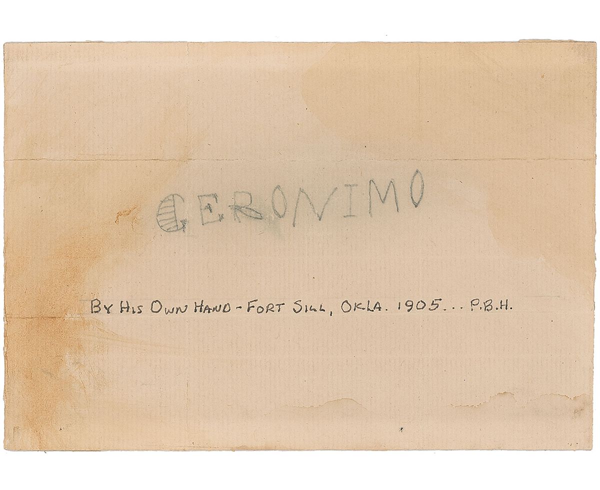 Chiricahua Apache (1829–1909) who attained the status of legend for his steadfast defense of Native American lands before surrendering in 1886. After years of imprisonment, Geronimo became a celebrity, appearing at such venues as the 1904 World’s Fair in St. Louis and in Theodore Roosevelt’s 1905 inaugural parade. Scarce pencil signature, “Geronimo,” on an off-white 6.25 x 4.25 sheet bearing a collector’s notation, “By his own hand—Fort Sill, Okla. 1905.” Intersecting folds (vertical folds unobtrusively passing through first and last letter), and light staining, otherwise fine condition. Accompanied by a period letter of transmittal in pencil with original mailing envelope, dated October 12, 1916, in part: “I hope this quick note finds you well and all is well at the hospital. Enclosed is the signature of the old chief Geronimo as promised. Hope you enjoy it.” After being moved for the last time to Fort Sill, Oklahoma, in 1894, Geronimo settled into old age as a celebrity—appearing at fairs (including the 1904 World’s Fair in St. Louis), riding in President Roosevelt’s 1905 inaugural parade, and releasing his popular autobiography the same year. A well-documented autograph of one of the most elusive and desirable Old West figures.