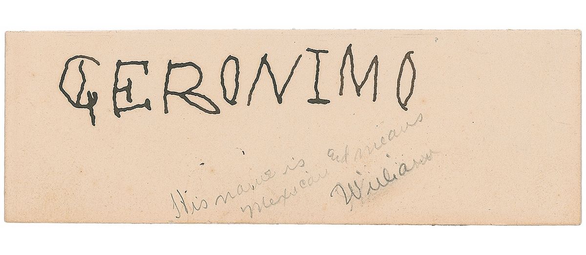 Ink signature, “Geronimo,” on an off-white 4.25 x 1.5 card with a collector’s pencil notation below claiming that his name is Mexican and means ‘William.’ In fine condition. Accompanied by a color photocopy of the original mailing envelope this was contained in, postmarked from Fort Sill, Oklahoma, on November 4, 1904. Geronimo had been at the World’s Fair in St. Louis until early October, when he returned to his home at Fort Sill. Also includes a modern photo of Geronimo and two engraved metal plaques suitable for framing and display.