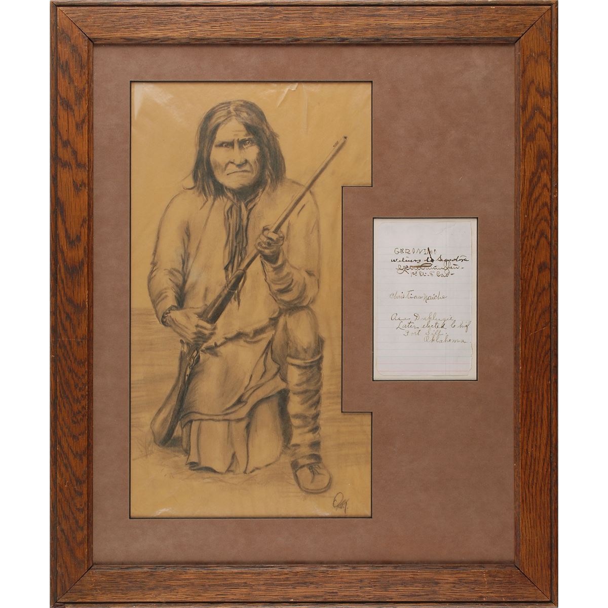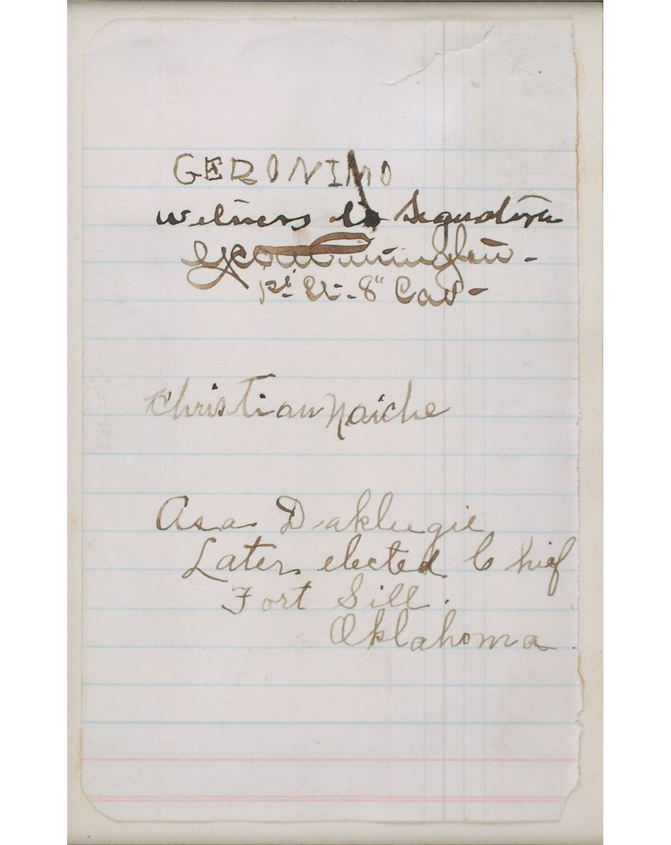 Ink signature, “Geronimo,” on an off-white 3.25 x 5 lightly-lined sheet also signed by the last Chiricahua chief, “Christian Naiche,” and the interpreter and leader of the Ndendai group of the Chiricahua band, “Asa Daklugie, Later elected Chief Fort Sill, Oklahoma.” Lieutenant George Albert Purington of the 8th Infantry, who was in charge of Geronimo and his fellow prisoners at Fort Sill, also signs below Geronimo’s signature as a witness. Attractively suede-matted and framed with an unattributed pencil sketch of the great Apache warrior to an overall size of 17.5 x 21.75. In fine condition, with a stray ink mark affecting one letter of Geronimo’s signature and unobtrusive tears to the upper right. Originates from an autograph book belonging to Clara Schofield, the daughter of General John Schofield. A fantastic, well-documented autograph of the Western legend along with the unusual addition of his two compatriots.