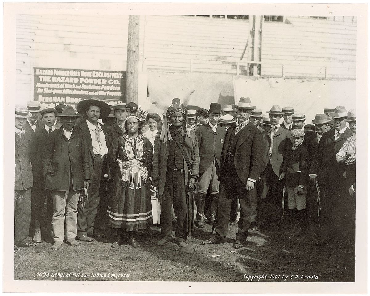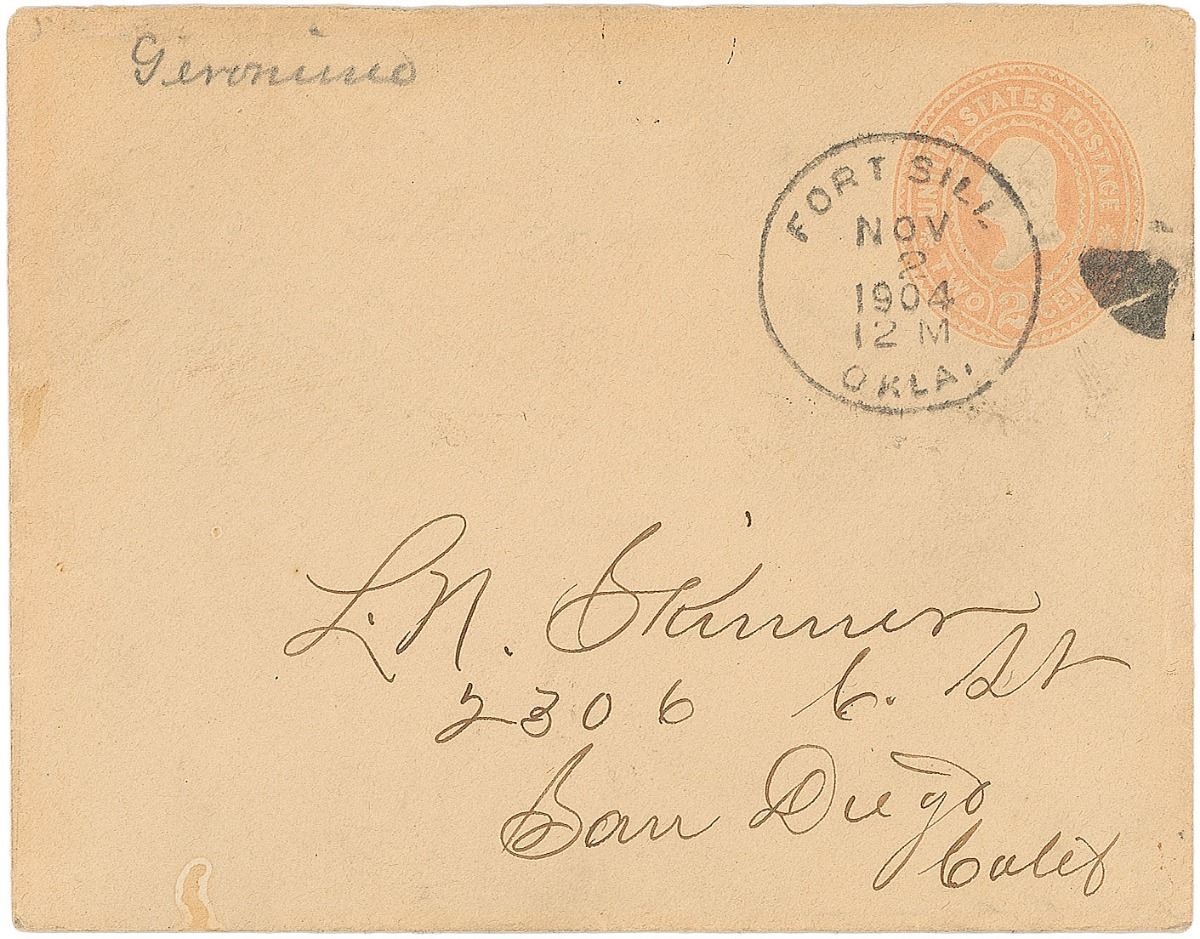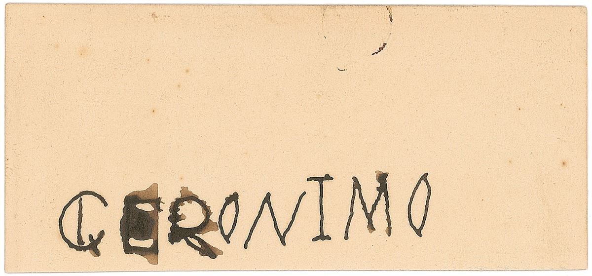 Incredibly bold ink signature, “Geronimo,” on an off-white 4.5 x 2 card. In very good condition, with stray ink blots affecting a few letters and slight foxing to card. Accompanied by an original mailing envelope postmarked at Fort Sill, Oklahoma, November 2, 1904. Also accompanied by a modern reprint photo. Geronimo had been at the World’s Fair in St. Louis until early October, when he returned to his home at Fort Sill.