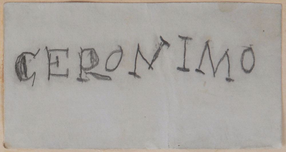 Highly sought-after pencil signature, “Geronimo,” on an off-white 3.5 x 1.75 slip affixed within a leatherbound scrapbook containing about thirty affixed signatures of other notables, including the general who convinced Geronimo to surrender in 1886, “Nelson A. Miles, Major General, US Army.” Other signers include: Russell A. Alger, Garret A. Hobart, William R. Shafter, Wesley Merritt, John R. Brooke, John J. Pershing, Lew Wallace, William S. Rosecrans, James Forsyth, William Jennings Bryan, Levi P. Morton, Eugene Field, James Whitcomb Riley, Palmer Cox, Julia Marlowe, Joseph Jefferson, and others. In very good to fine condition. A supremely desirable compendium of signatures.