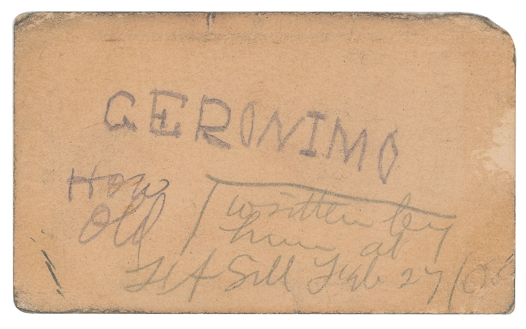 Rare pencil signature, "Geronimo,” on the reverse of an off-white 3.75 x 2.25 business card belonging to the Oklahoma City law firm Pruiett, Cardwell & Sniggs, with another adding in pencil below, "How old / written by him at Ft. Sill Feb 27/08." In very good to fine condition, with light soiling and edge wear.
