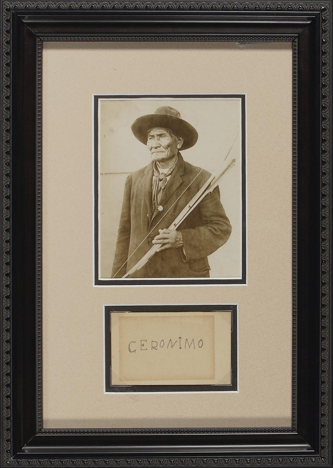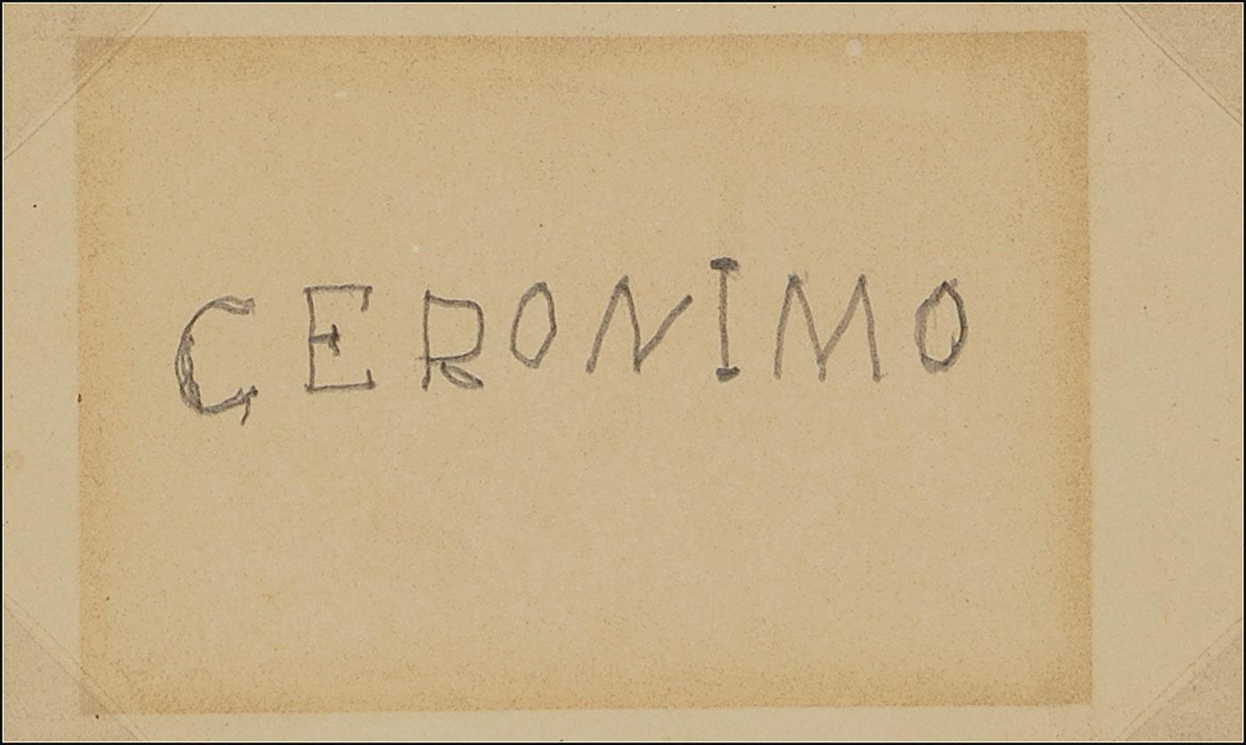Chiricahua Apache (1829–1909) who attained the status of legend for his steadfast defense of Native American lands against the United States government. After decades of aggressive resistance, Geronimo surrendered to General Nelson A. Miles at Skeleton Canyon, Arizona, on September 4, 1886. After years of imprisonment, followed by “military confinement,” Geronimo became a celebrity, appearing at such venues as the 1904 World’s Fair in St. Louis (where he sold autographs to curiosity seekers) and in Theodore Roosevelt’s 1905 inaugural parade, and dictating his autobiography. Rare bold pencil signature, “Geronimo,” in his distinctive block-printed hand, on an off-white 4 x 2.5 card. Archivally matted and framed, with a photo of Geronimo, to an overall size of 10.75 x 15. In fine condition, with a uniform block of toning over signature. Among the most elusive and desirable of Old West signatures!