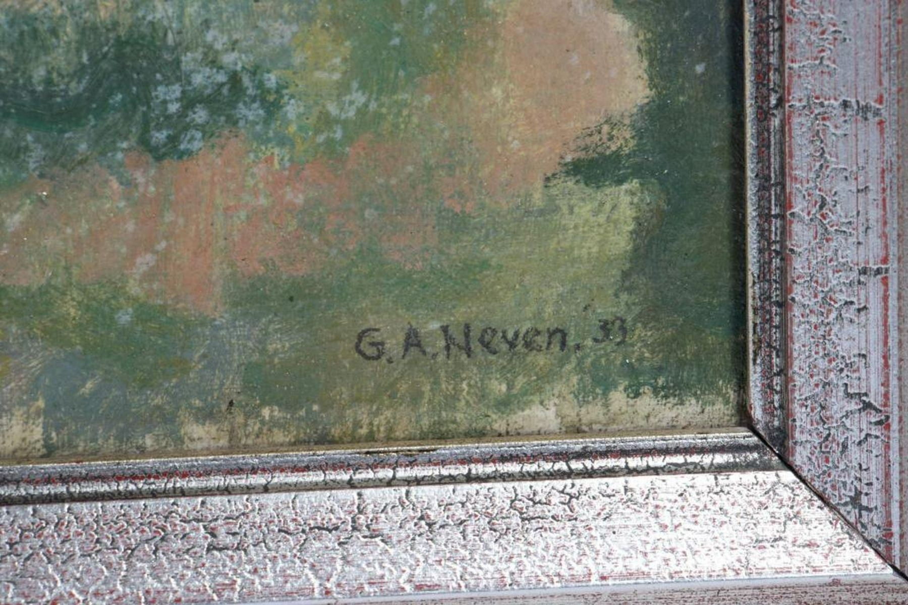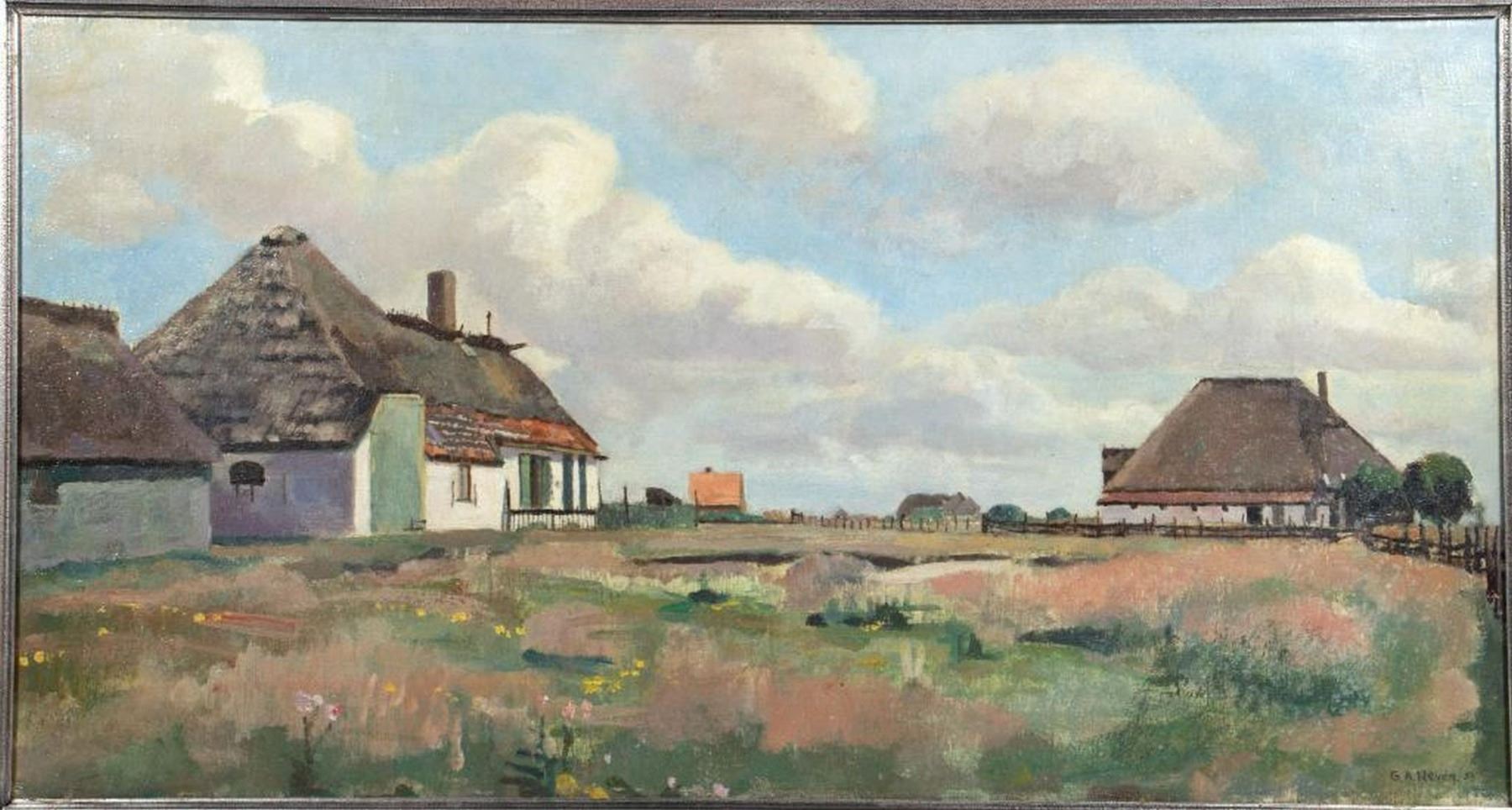 Title: Blooming meadow between houses. Signed and dated l/r: "G.A. Neven '33". Medium: Oil on canvas. Dimensions: 14 x 26 1/2 in. (image); 18 x 30 1/2 in. (frame). Condition: very good.