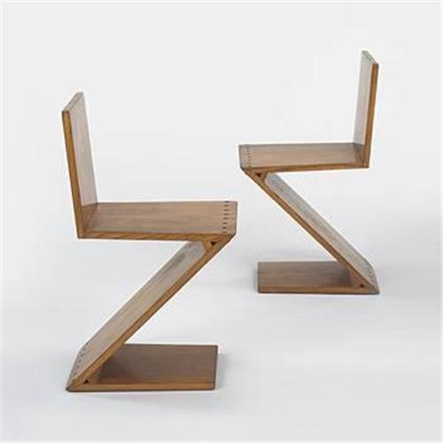 Gerrit Rietveld Zig-Zag chairs, pair G. A. van de Groenekan Netherlands, c. 1960 pine 14.75 w x 16.5 d x 29 h inches The ability to manufacture a chair without back legs was a phenomenon mastered with the introduction of tubular steel furniture. The Zig-Zag chair was Rietveld's reaction to and mastery of the cantilever concept. He designed the form to imitate planes intersecting in space rather than within the object itself. Signed with branded manufacturer's mark to underside of each example: [G.A. van de Groenekan]. Literature: Gerrit Th. Rietveld - The Complete Works, Kuper and van Zijl, ppg. 145-147 The Complete Rietveld Furniture, Voge, ppg. 82-87