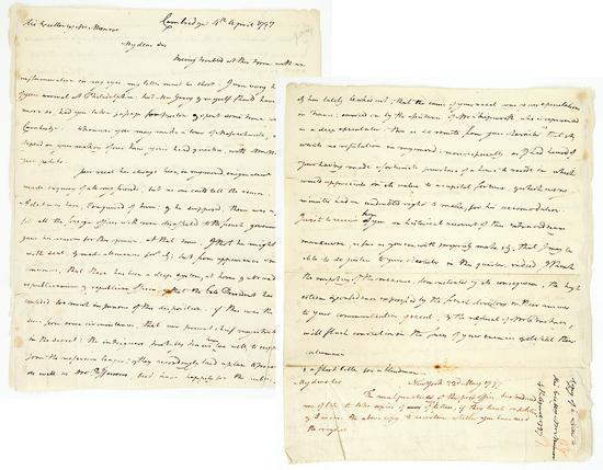 Gerry, Elbridge (1744-1814) Signer of the Declaration of Independence and member of the Continental Congress; one of three men who refused to sign the U.S. Consntitution without a Bill of Rights; U.S. Congressman, Governor of Massachusetts, and Vice President of the U.S. The term "gerrymandering" was coined from Gerry's name. Excellent content Autograph Manuscript, 2 pp (1 sheet), 9 x 7¼ in., Cambridge, April 4, 1797. Being Gerry's retained copy of a letter he sent to future President James Monroe, who had just been recalled from France; this copy was actually sent to Monroe, as evidenced by Gerry's note at the end. In part: " I am very happy to hear of your arrival at Philadelphia; but Mrs. Gerry & myself should have been much more so, had you taken passage from Boston & spent some time with us….Your recal [sic] has always been, in my mind, enigmatical. I have made enquiry of all my friends, but no one could tell the reason. When Mr. [Pierre] Adet [French minister to the U.S.] was here, I enquired of him; & he supposed, there was a plan to fill all the foreign offices with men disaffected to the french government….I am convinced, that there has been a deep system, at home & abroad, to disgrace republicanism & republican officers, & that the late President [Washington] has unfortunately confided too much in persons of this disposition. If this was the case, I am sure…that our present chief magistrate was not in the secret: the intriguers probably knew him too well, to suppose he would join the nefarious league; & they accordingly laid a plan to prevent his election, as well as Mr. Jeffersons, but have happily for the public, failed…" Gerry dismisses rumors that Monroe's recall had to do with land speculation, and waits to get Monroe's own account so that "I may be able to do justice by your character…I think…the high esteem…expressed by the french directory in their answer to your communication of recal, & the refusal of mr. Pinckney, will flash conviction in the faces of your enemies & defeat their calumnies…." A note in Gerry's hand at the bottom says, "The malpractice of the post office has induced me of late to take copies of my letters, if they touch on politics, & I inclose the above copy to ascertain whether you have recd the original."