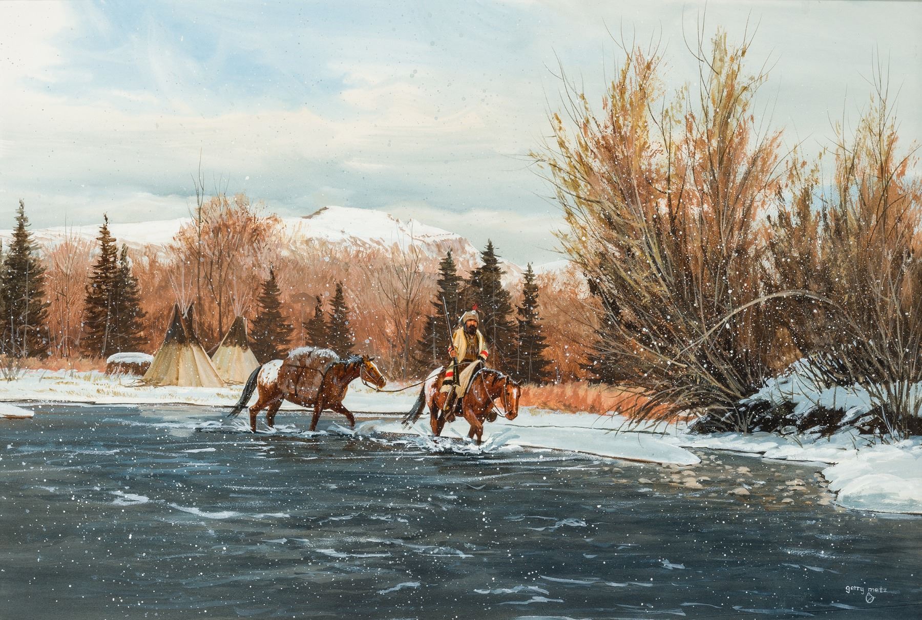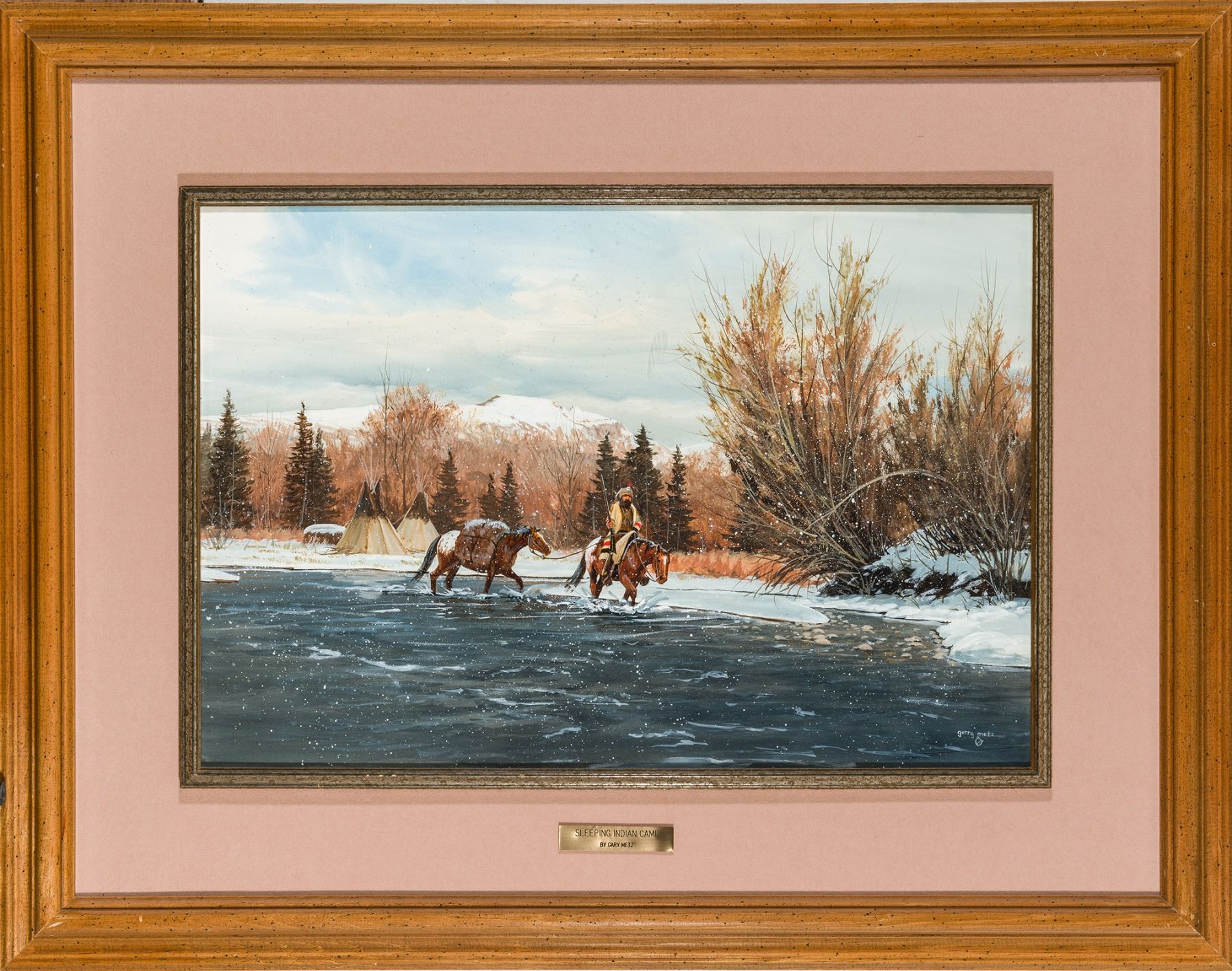 Condition details: This piece is in very good condition.  With the unaided eye, there are no issues. Closer inspection under ultraviolet light reveals no issues and no signs of restoration. The work is mounted under glass and has not been inspected out of the frame. The piece is framed in a brown frame with a light brown suede mat and a silver fillet. The frame is in very good condition with normal wear.  Goldplate: Sleeping Indian Camp by Gerry Metz