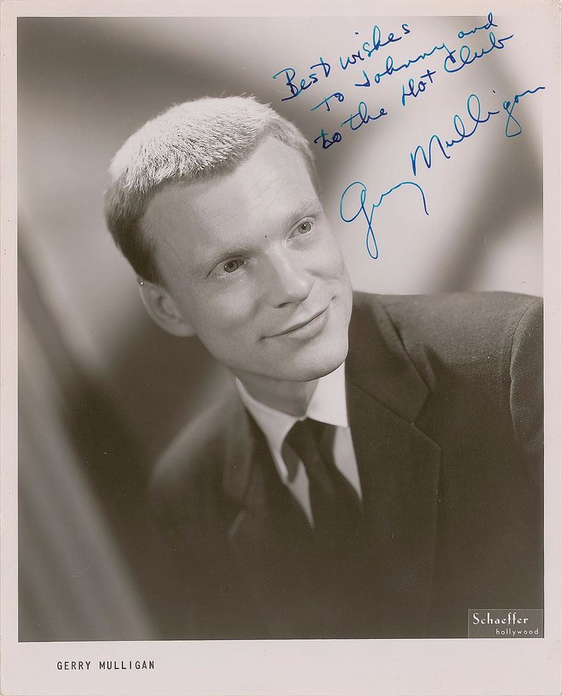 American jazz saxophonist, clarinetist, composer, and arranger (1927-1996), who is primarily known as one of the leading jazz baritone saxophonists, having played with Claude Thornhill, Miles Davis, Stan Kenton, and Chet Baker. Several of his compositions, such as 'Walkin' Shoes' and 'Five Brothers,' have become jazz standards. Vintage glossy 8 x 10 publicity of Mulligan in a close-pose by Schaeffer of Hollywood, signed and inscribed in blue fountain pen, "Best wishes to Johnny and to the Hot Club, Gerry Mulligan.” In fine condition.