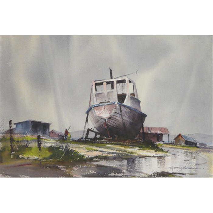 Gerry Peirce (1900-1969) Watercolor, Beached trawler, 14 1/2" x 21 1/2", Signed lower right.
