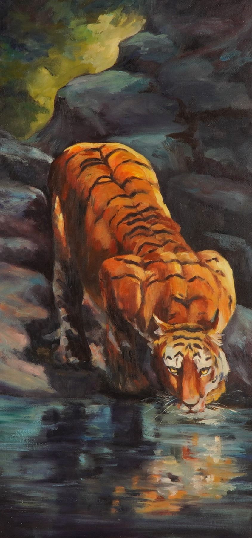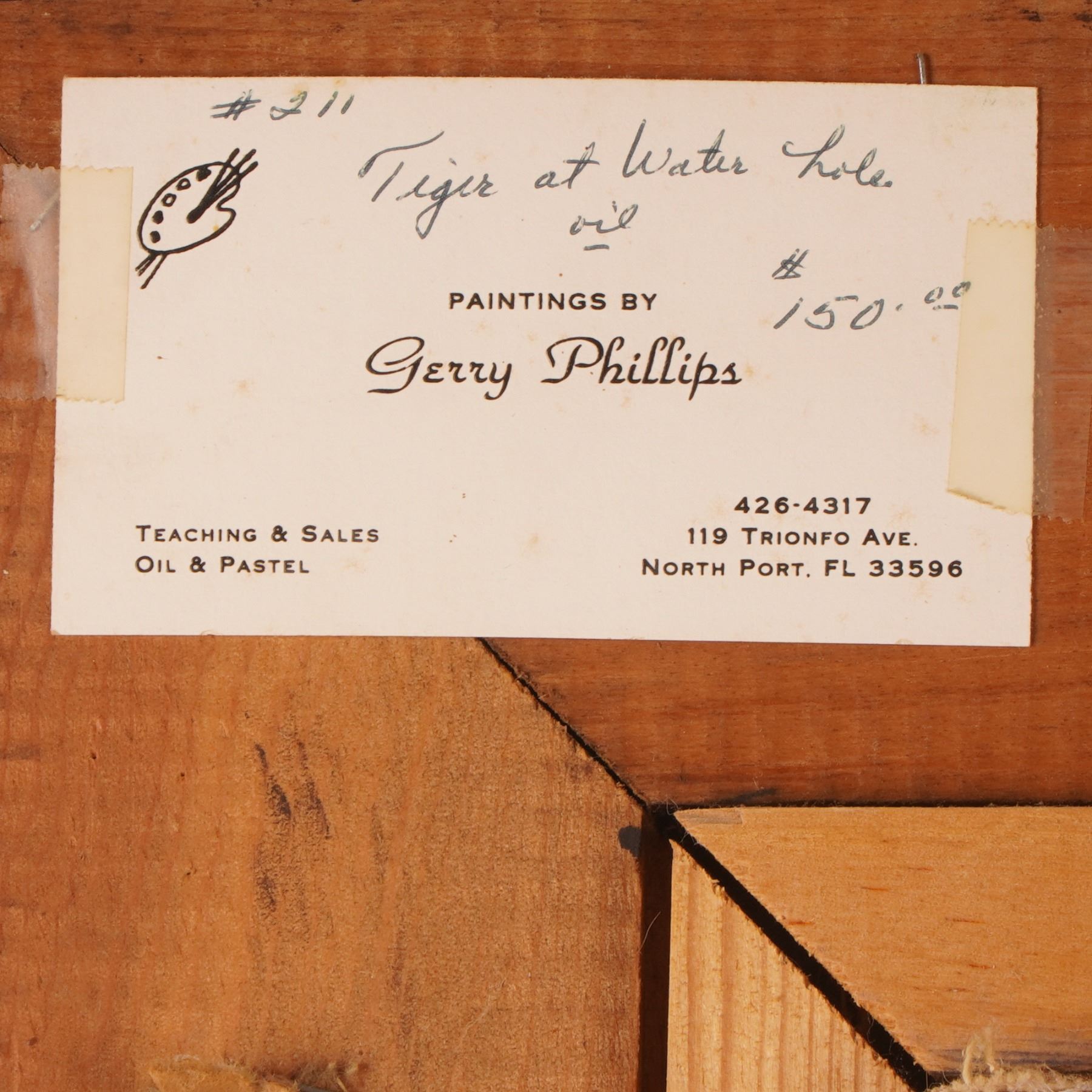 Gerry Phillips, Oil on Canvas Painting, Tiger at Water Hole, Signed
