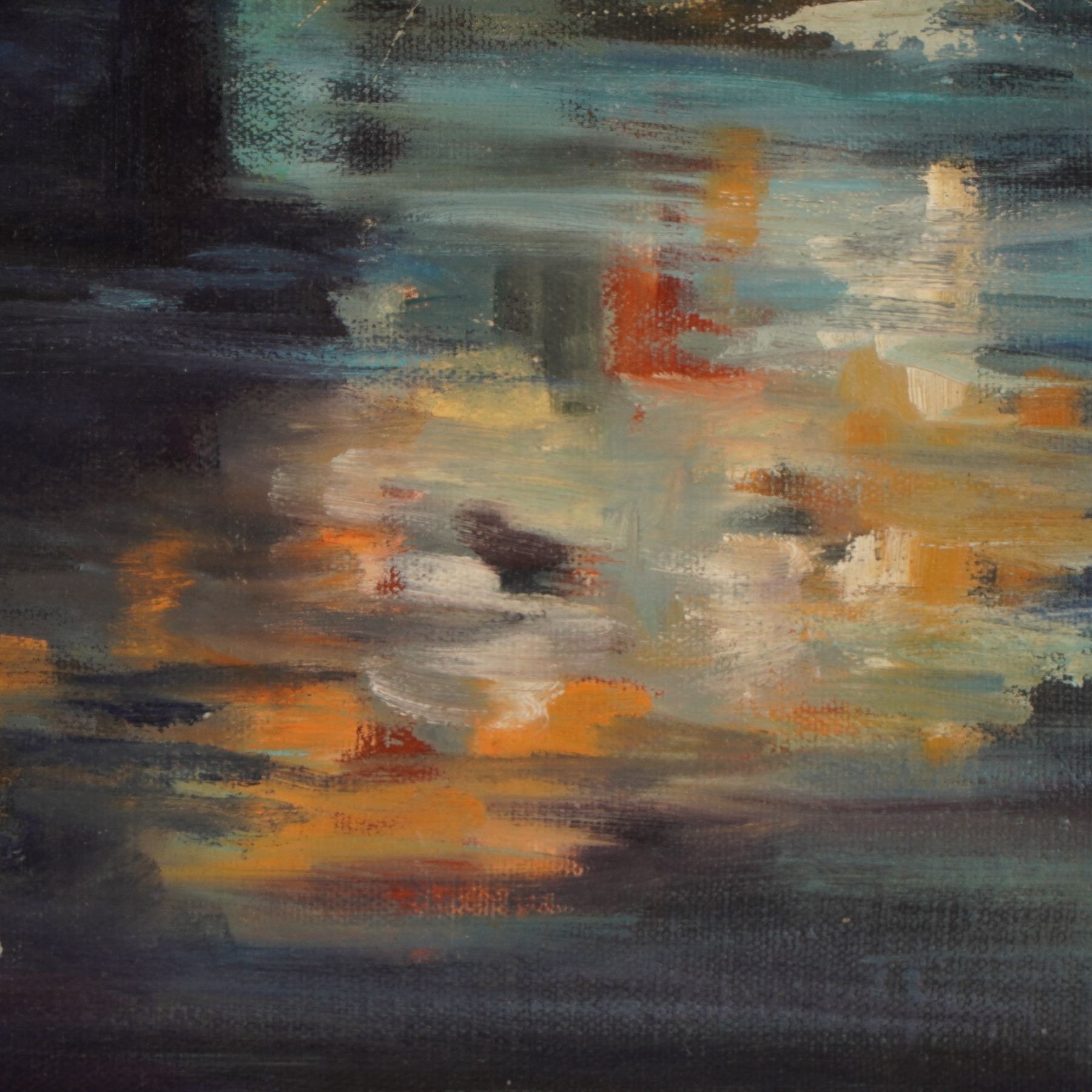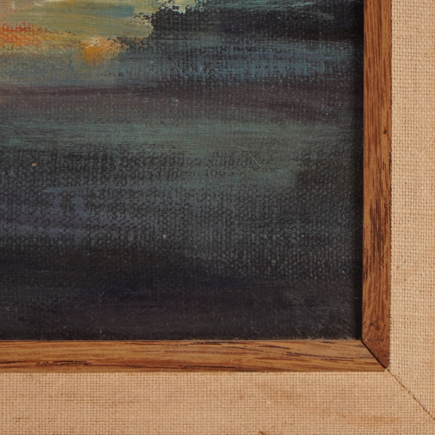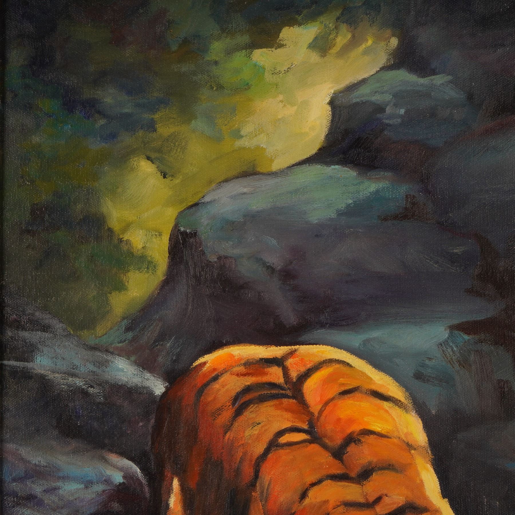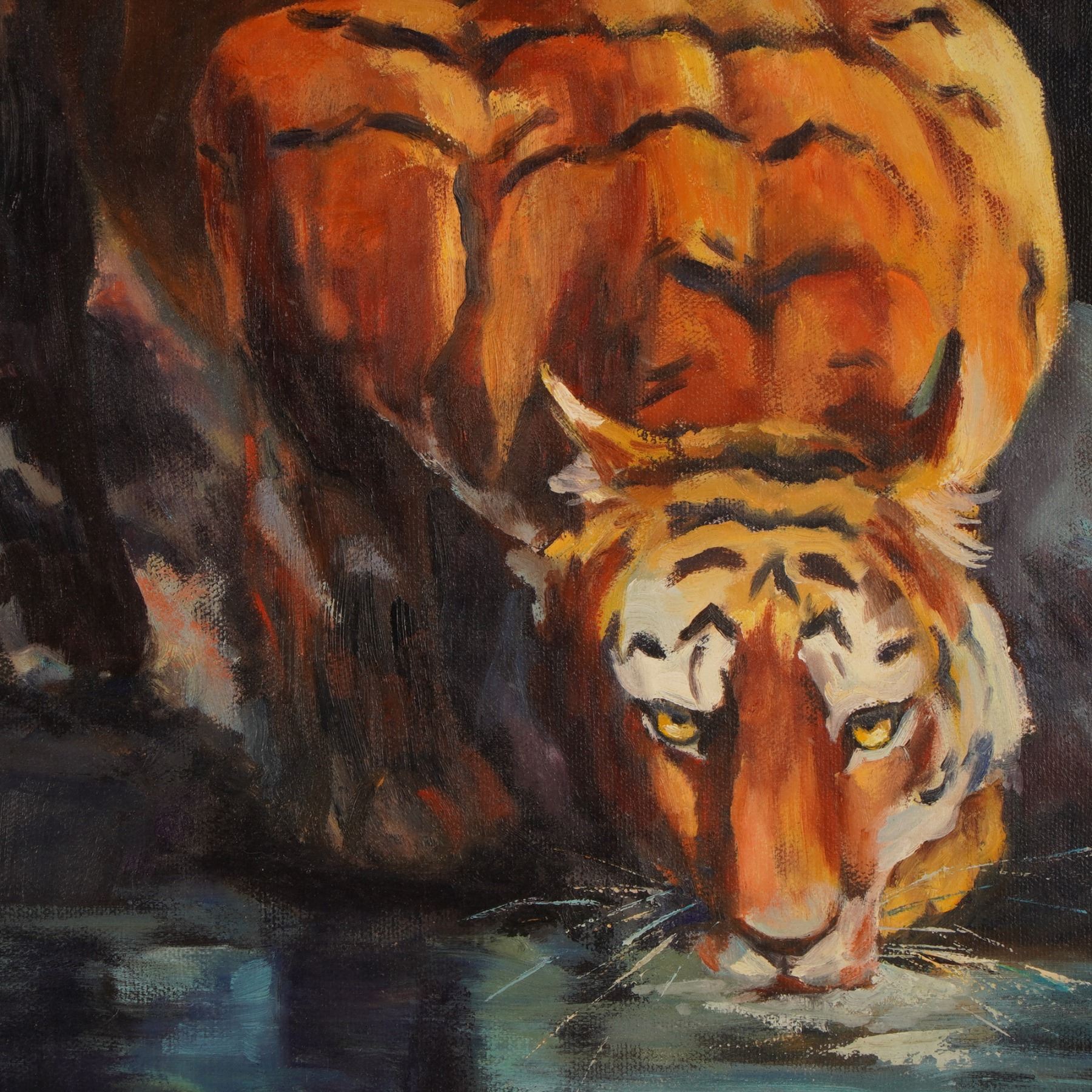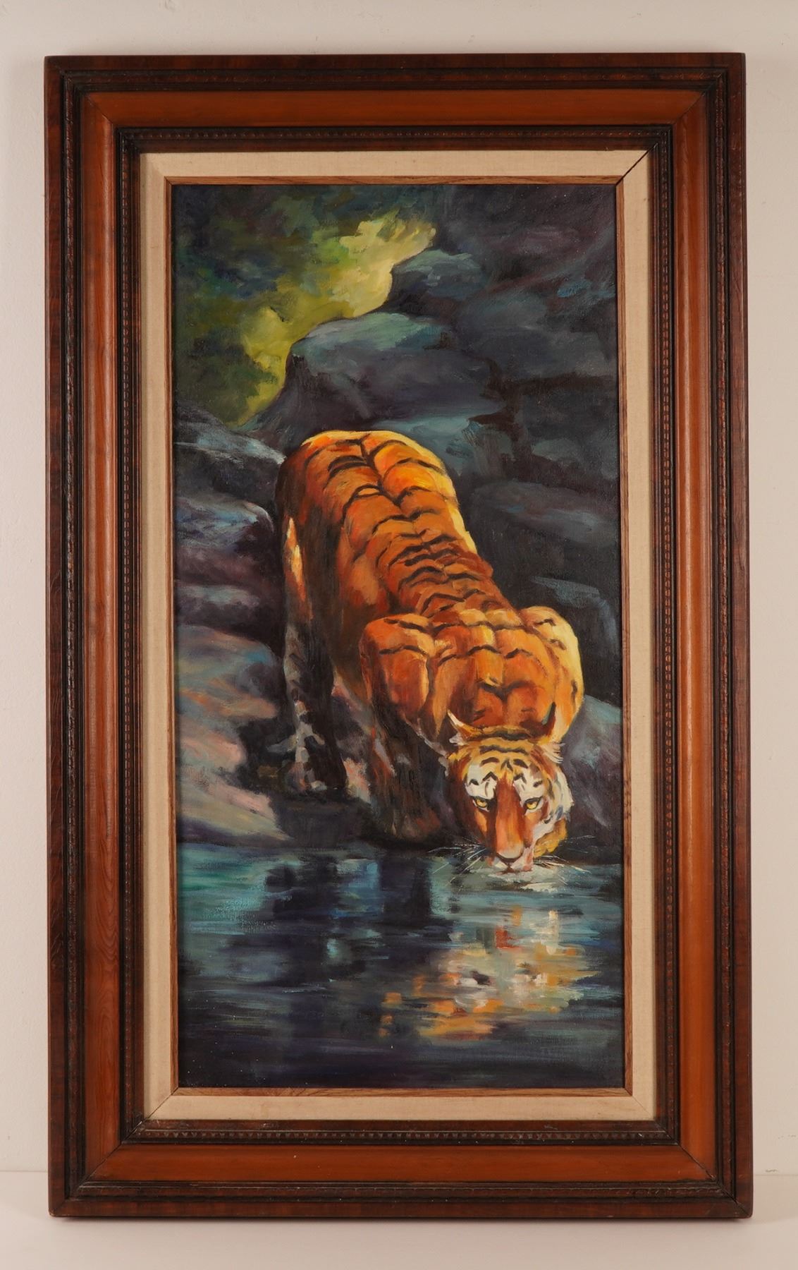 Oil on canvas painting depicting a majestic tiger bending to drink from a shimmering pool, the animal's intense gaze reflected in the water beneath a dark, rocky backdrop illuminated by a golden-green glow. Phillips's use of light and reflection lends a dynamic, almost spiritual energy to the composition, evoking both the grace and latent power of the tiger in its natural habitat. The bold brushwork and vivid contrasts of orange, indigo, and emerald tones demonstrate a confident hand and a strong sense of mood. Housed in its original wooden frame with warm patina, the painting retains the artist's original gallery label on verso, inscribed with the title and the artist's location in North Port, FL.