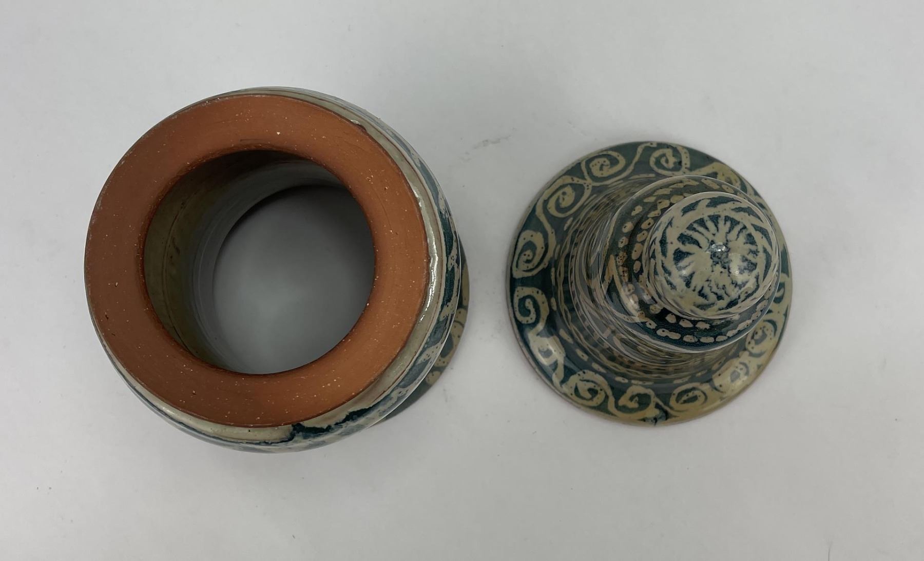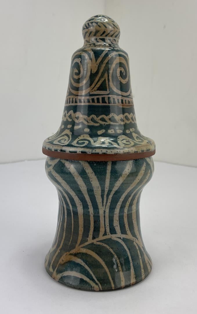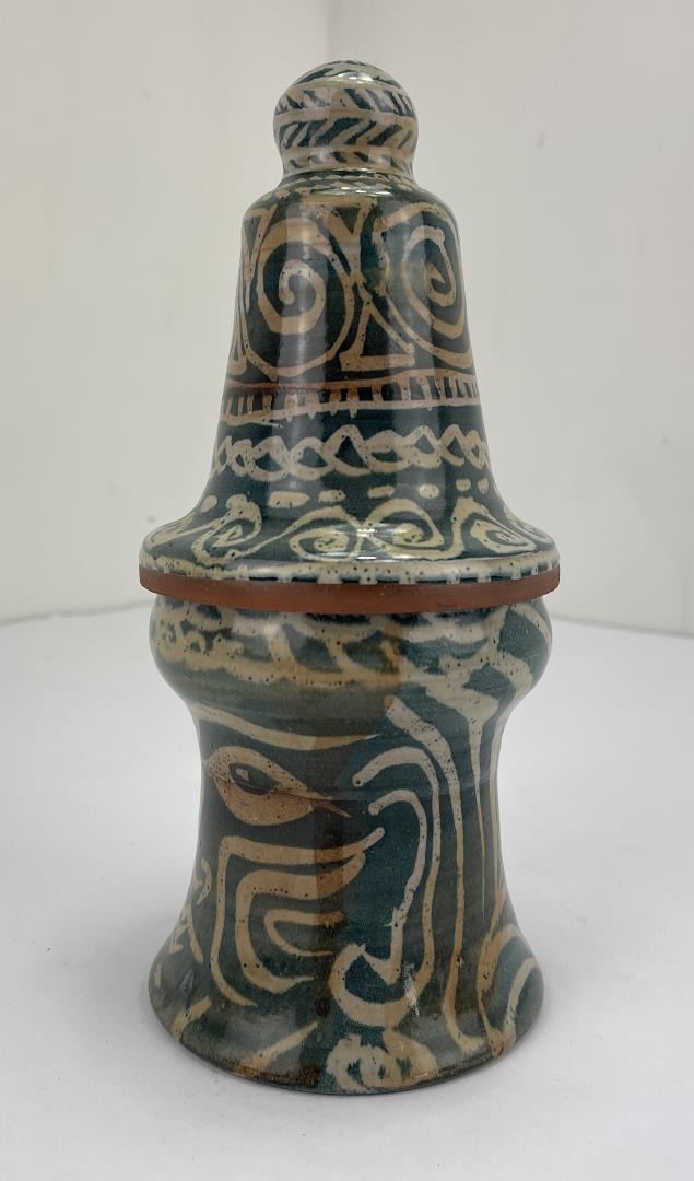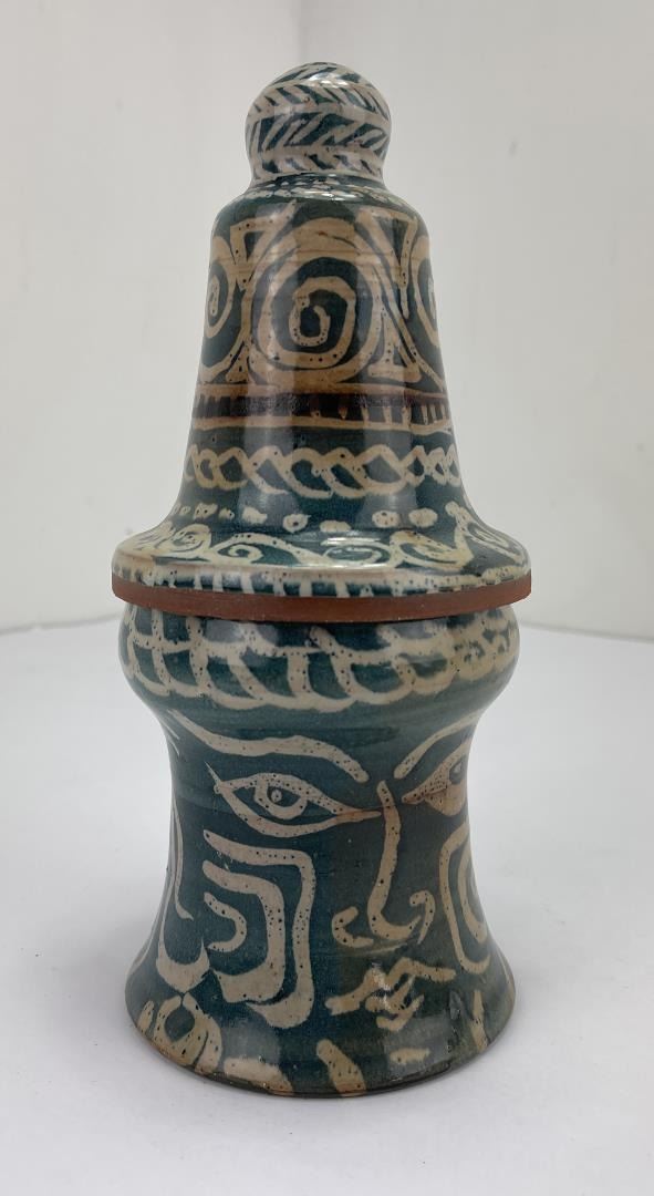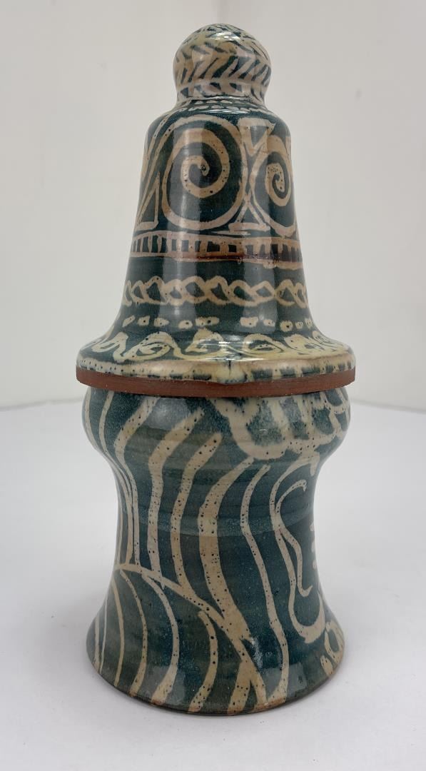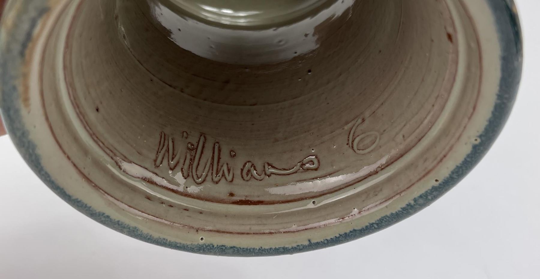 Nice covered vessel. Possibly for incense. Signed as shown. Artist is Gerry Williams 9.25" tall.