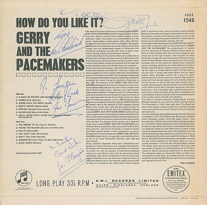 How Much Do You Like It? album signed and inscribed on the reverse in blue ballpoint by Gerry Marsden, Les Chadwick, Les Maguire, and Fred Marsden; also signed on the front cover by Fred Marsden and Les Chadwick. In fine condition, with some creases to edges (most noticeably to upper right corner). The record is included. Accompanied by a certificate of authenticity from Tracks.