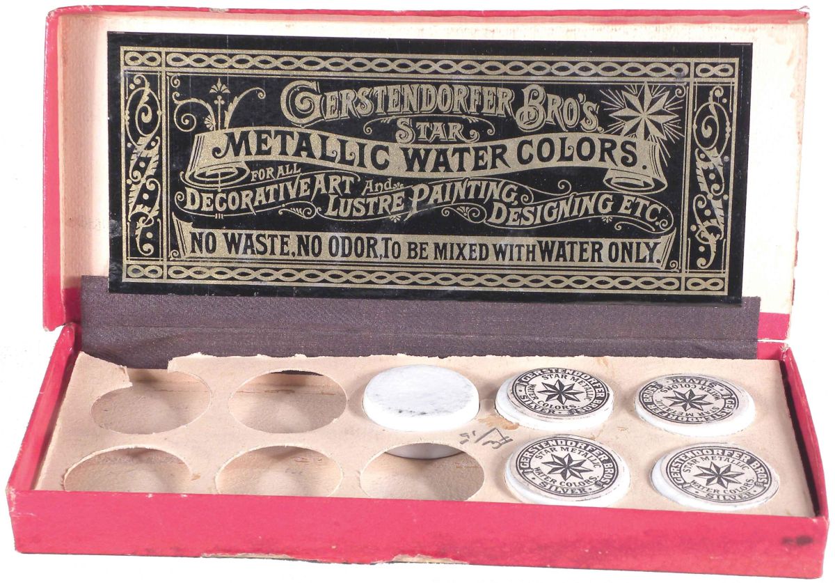 Gerstendorfer Bro's Star Metallic Water Colors, original box. Five jars left, four with labels. One end missing off box lid otherwise good condition. 7 1/2 X 3 1/4 X 3/4 inches. Start Price $20