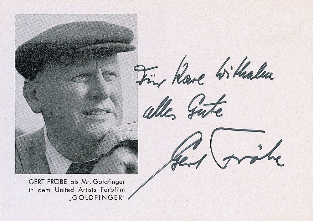 Uncommon 5.75 x 4 paperstock photo of Frobe as Goldfinger, signed and inscribed in German in black felt tip. In fine condition.