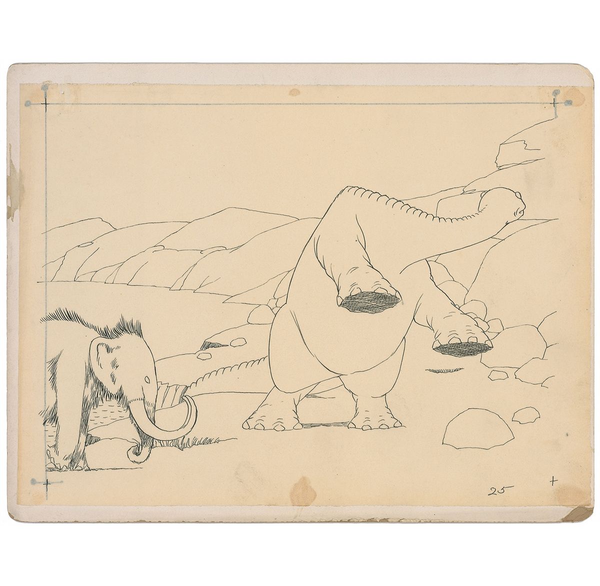 (Winsor McCay, 1914) Original production drawing featuring Gertie and Jumbo the Mastodon from Gertie the Dinosaur, showing Gertie looking behind her as the mastodon appears in the lower left. Accomplished in ink on 9 x 6.75 rice paper and affixed to a slightly larger mount. In fine condition, show-through from adhesive at edges. In the cartoon, Jumbo walks across the scene in front of Gertie, who picks him up by the tail and hurls him into the lake. While Gertie dances in triumph, Jumbo squirts her with water. Gertie then retaliates by throwing a rock at him. McCay made 10,000 drawings in the creation of the film, of which only 400 are known to have survived, making this a rare and very desirable depiction of these two prehistoric characters.