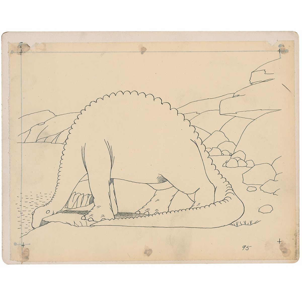 (Winsor McCay, 1914) Original production drawing featuring Gertie from Gertie the Dinosaur, showing the dinosaur drinking from a lake. Accomplished in ink on 8.75 x 6.75 rice paper and affixed to a slightly larger mount. In fine condition, show-through from adhesive at edges. Gertie the Dinosaur was McCay's first piece of animation with detailed backgrounds, and this scene shows Gertie drinking from a lake after growing tired from all of her activities—she ends up drinking it dry. Gertie is considered McCay’s masterpiece, and this very rare production drawing features a large and exceptional full-length depiction of the dinosaur in which her face is visible.