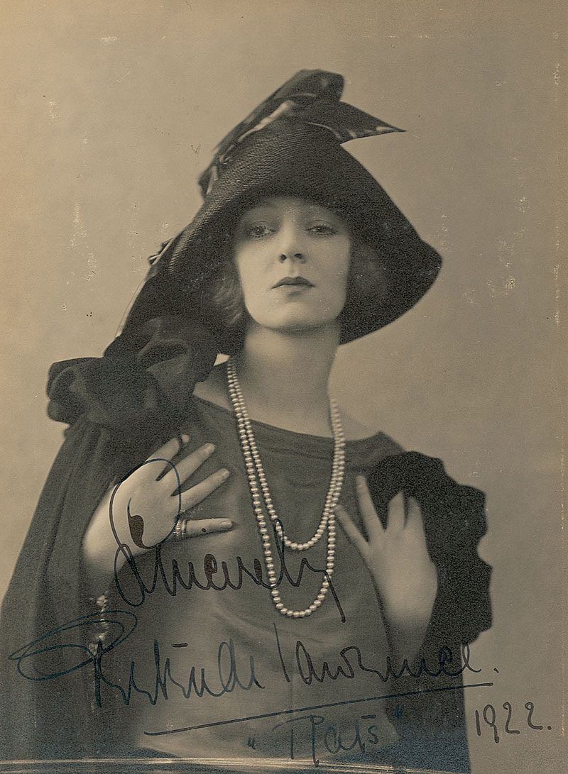 Early vintage matte-finish 5.75 x 8 photo of Lawrence in a black jacket and hat, signed in fountain pen, “Sincerely, Gertrude Lawrence, ‘Rats’ 1922.” Photo is affixed to a slightly larger page. In fine condition.