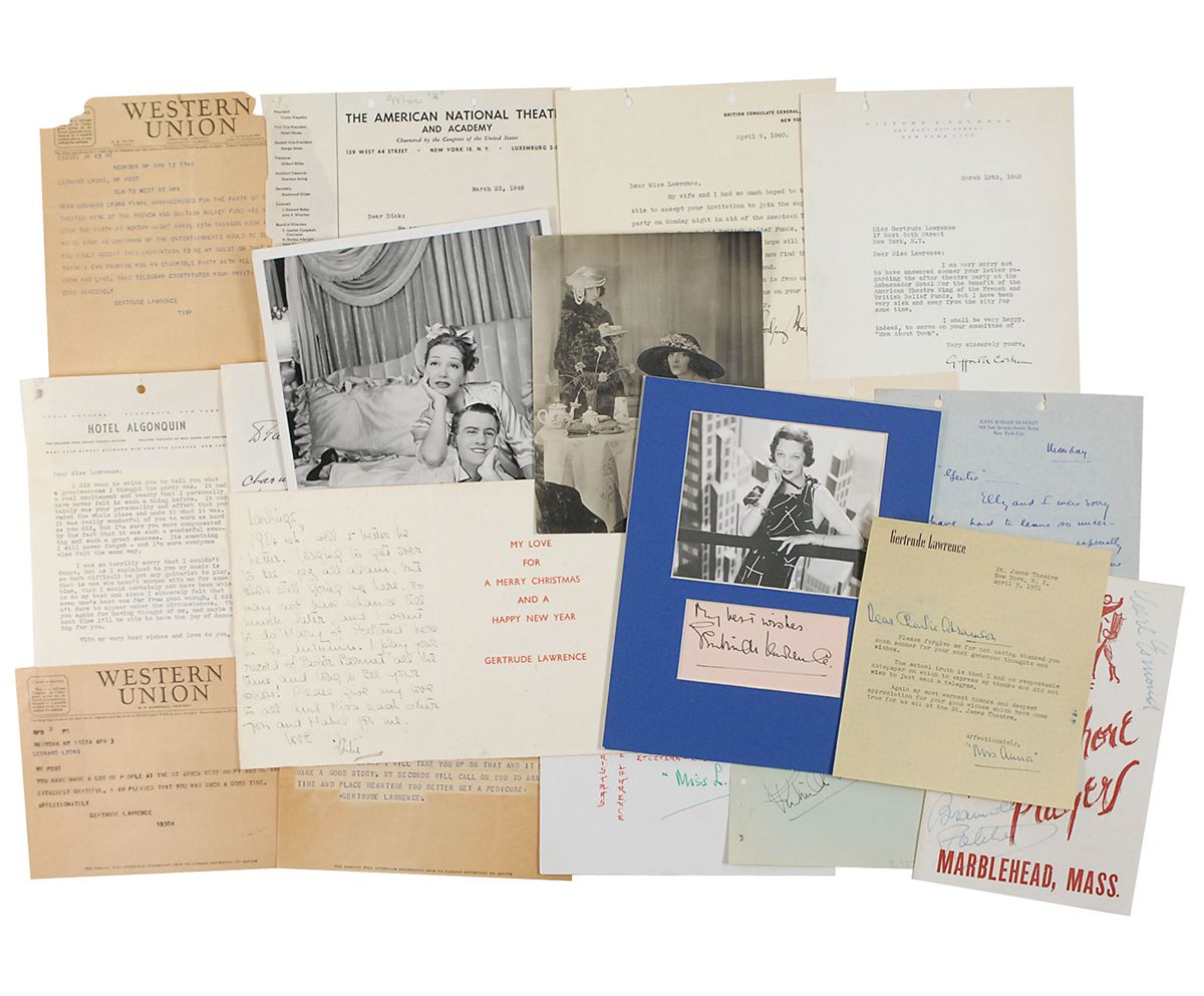Collection of 19 items consisting of signed and unsigned items. Included in the collection are: an ink signature, “My best wishes, Gertrude Lawrence,” on a light peach card; several Western Union telegrams to Leonard Lyons; an ALS, signed “Gertie,” on the inside of a Christmas card; a TLS, signed “‘Mrs. Anna,’” to Charlie Abrahamson; a vintage fountain pen signature on a light green album page; and a 1947 Playbill from the North Shore Players, signed on the cover by Lawrence and two others. In overall fine condition. Provenance: The John Strangi Collection.