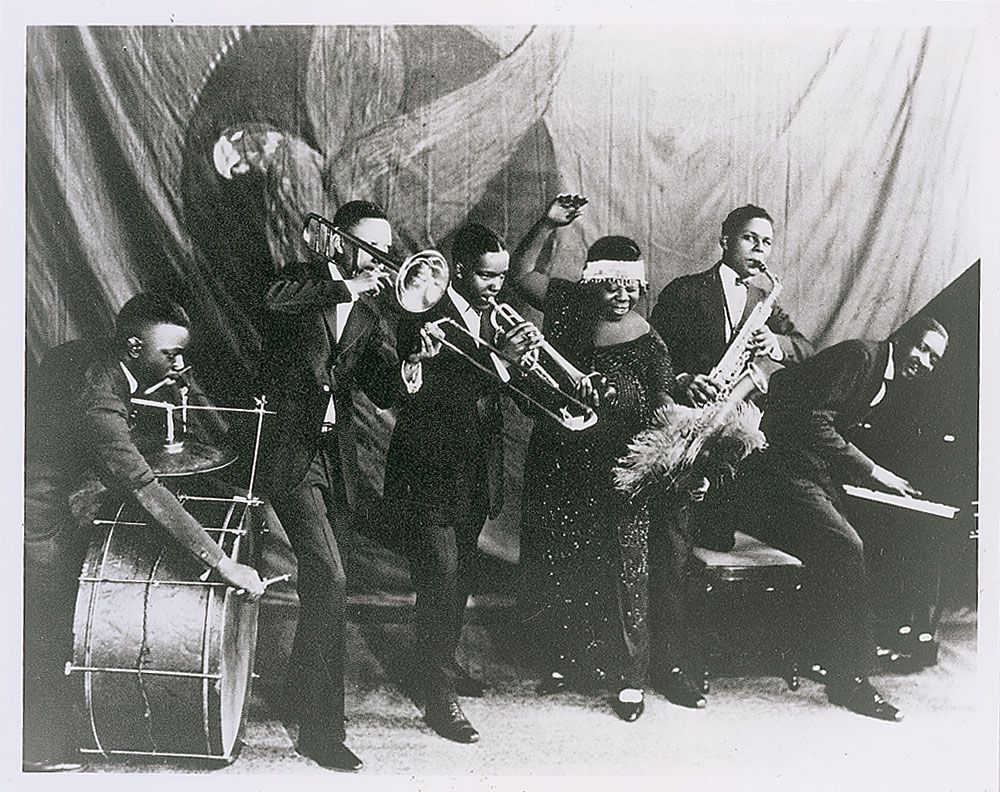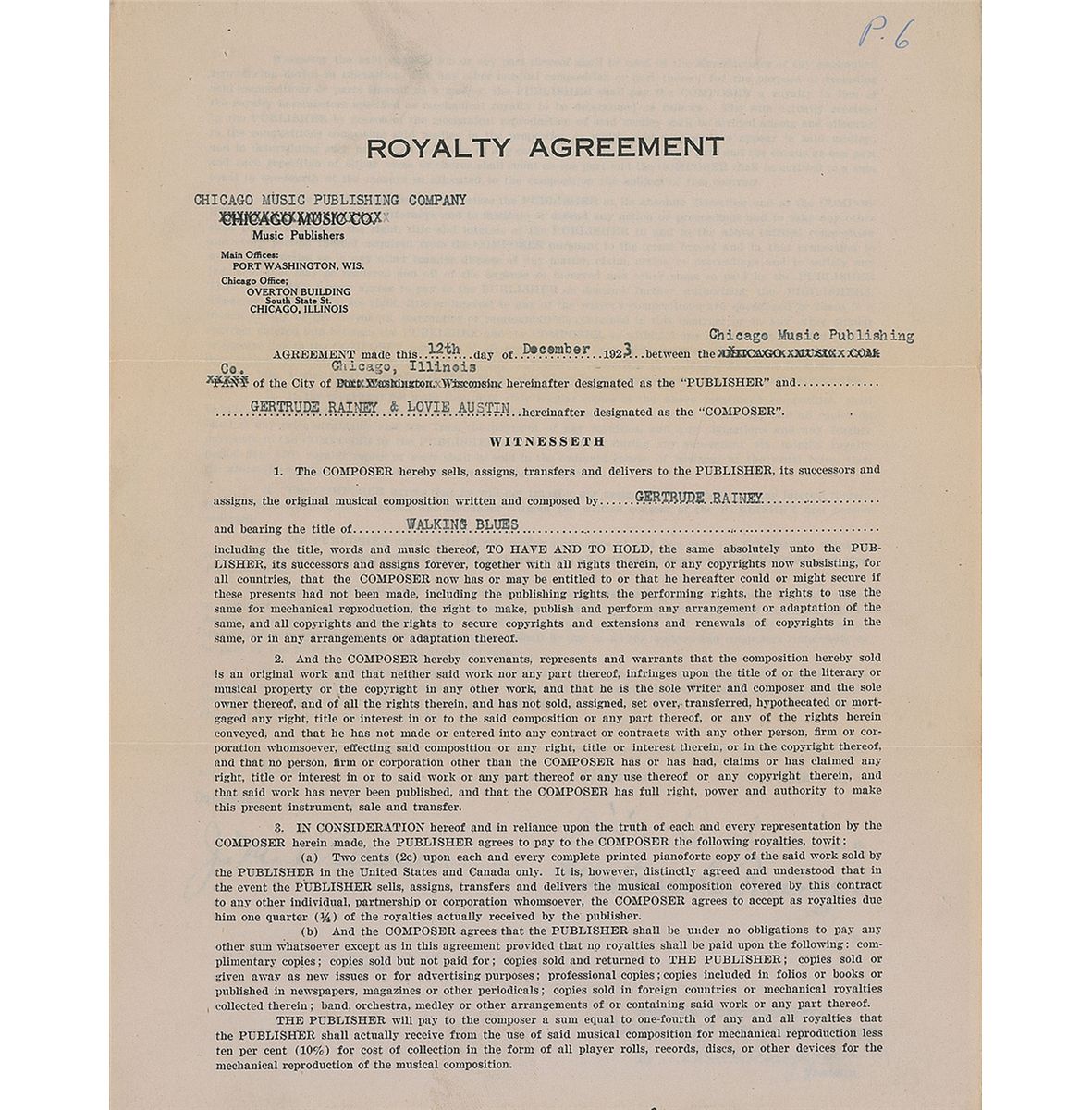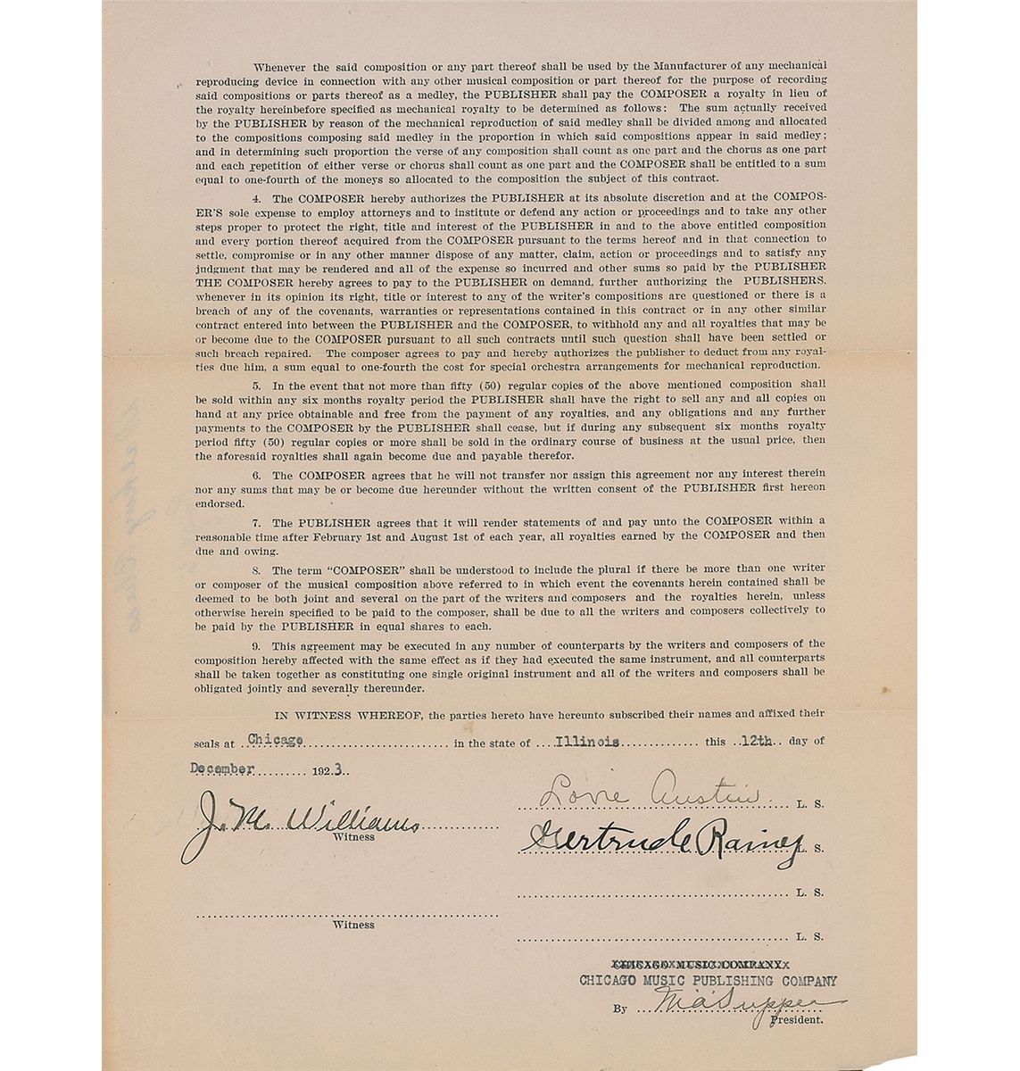 One of the earliest known American professional blues singers (1886–1939), and one of the first generation of such singers to record. DS, signed “Gertrude Rainey,” two pages, 8.5 x 11, December 12, 1923. Royalty agreement between the Chicago Music Publishing Company and Rainey for a song titled ‘Walking Blues,’ with Rainey receiving two cents for each piano copy sold, as well as 25% of the royalties for mechanical reproduction. Signed on the second page by Rainey and Lovie Austin, and witnessd by legendary A&R man J. Mayo Williams. In fine condition, with expected document wear. Accompanied by an unsigned glossy photo of Rainey and her band.