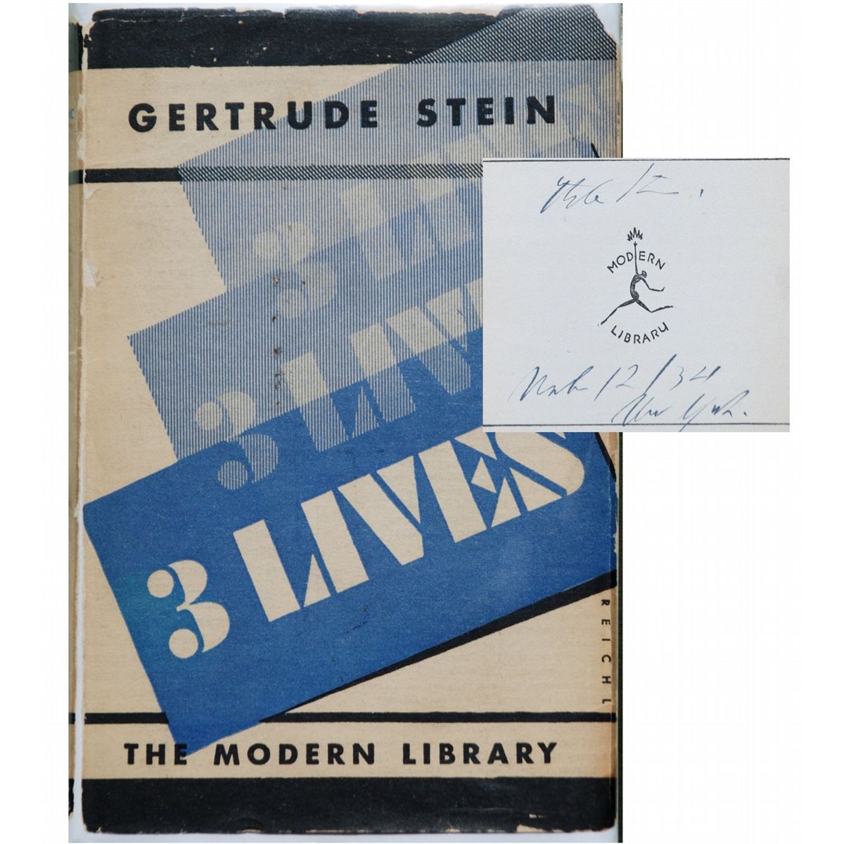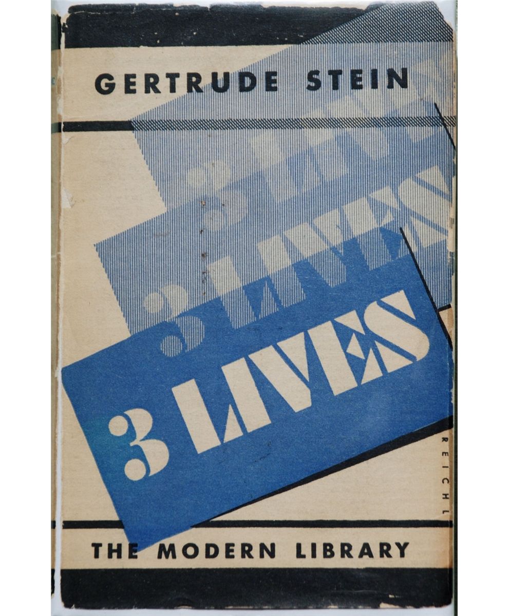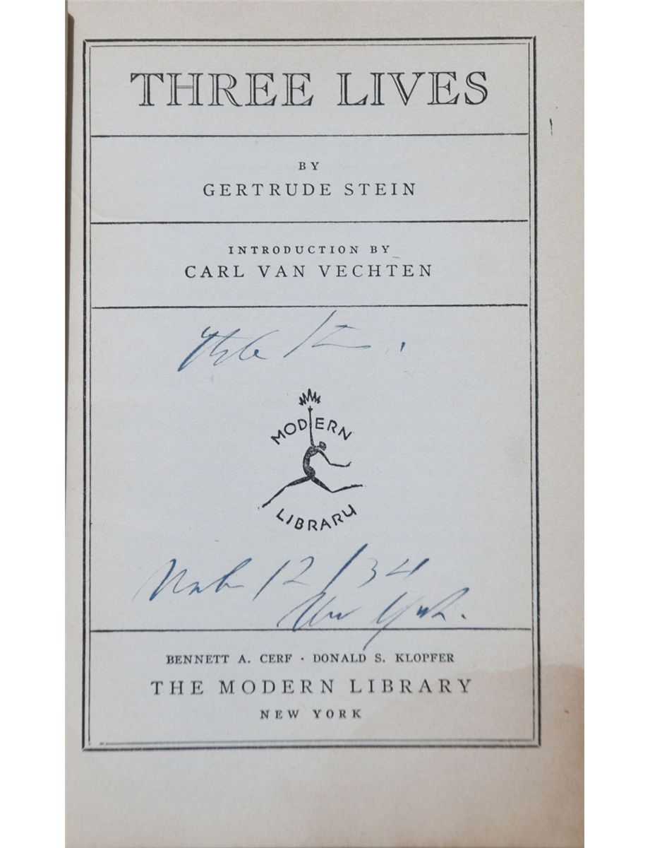 Three Lives. New York: The Modern Library, [1933). Modern Library edition, later printing. Inscribed by Stein on the title page and dated in the year following publication. Sixteen mo. 279 pages. Publisher's flexible brick cloth with gilt titles. Original pictorial dust jacket. Some rubbing to board edges. Jacket is significantly edgeworn and rubbed, with miscellaneous pencil notations on front flap. Large dampstain to bottom edge of preliminary pages and textblock: visible on title page, but not affecting inscription. Overall, a very good copy in a good dust jacket.