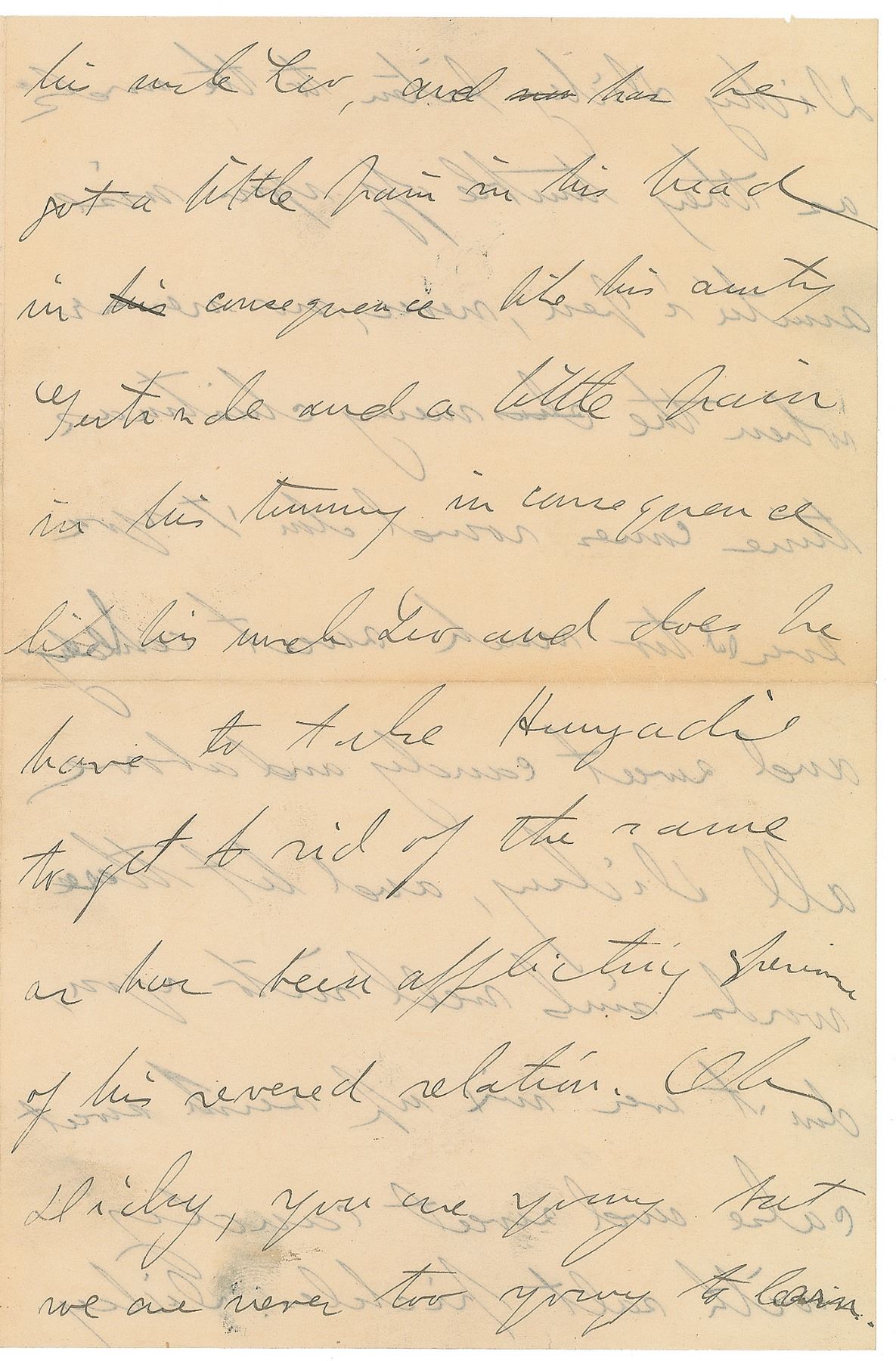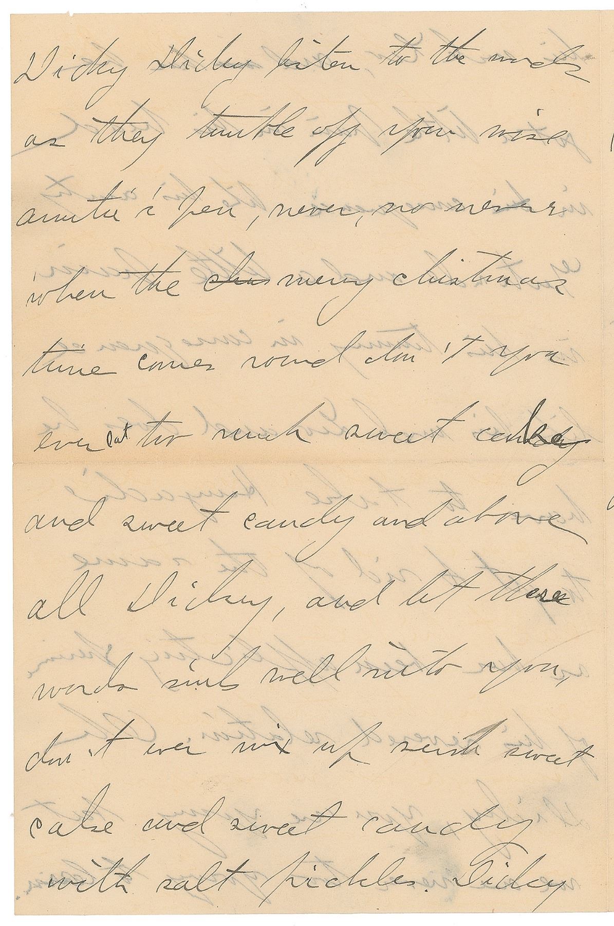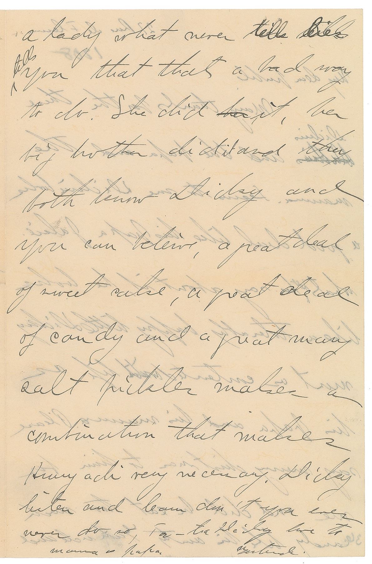 ALS signed "Gertrude," four pages on two adjoining sheets, 5.5 x 8.25, no date but notated 1908 in pencil. Letter to her old friend Hortense Guggenheimer Moses and her son Dickey. In part: "Many thanks for the three Dickies and the papa and the mama. Seems to me Dickey looks a good deal like his papa Jakie…Please say Merry Christmas to him…and did he eat too much candy like aunty Gertrude…Oh Dickey, you are going but we are never too young to learn. Dickey Dickey listen to the words as they tumble off your wise auntie's pen, never, no never when the merry Christmas time comes round don't you ever eat too much sweet cake and sweet candy and above all Dickey, and let these words sink well into you, don't ever mix up such sweet cake and sweet candy with salt pickles. Dickey a lady what never tells lies tells you that that's a bad way to do…Dickey listen and learn don't you ever never do so." In fine condition, with show-through from writing to opposing sides and a trivial fingerprint at the bottom. A fine example of the distinctive literary style that Stein maintained even in general correspondence.