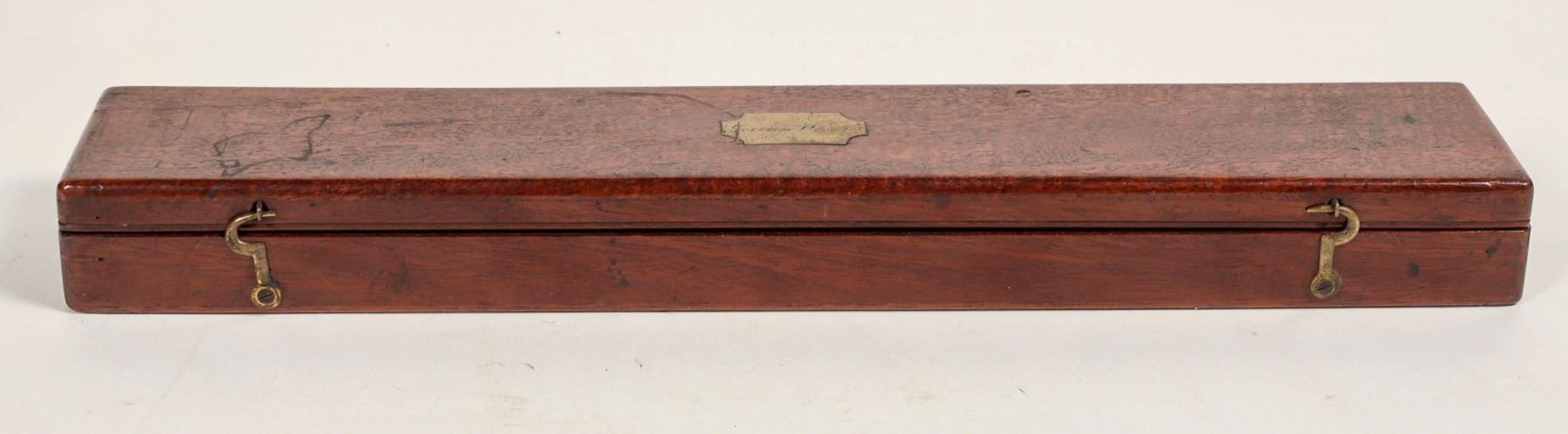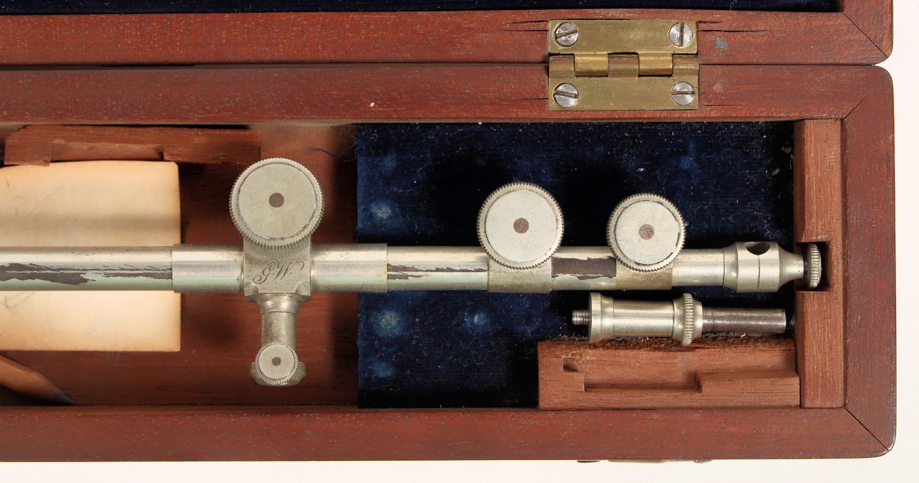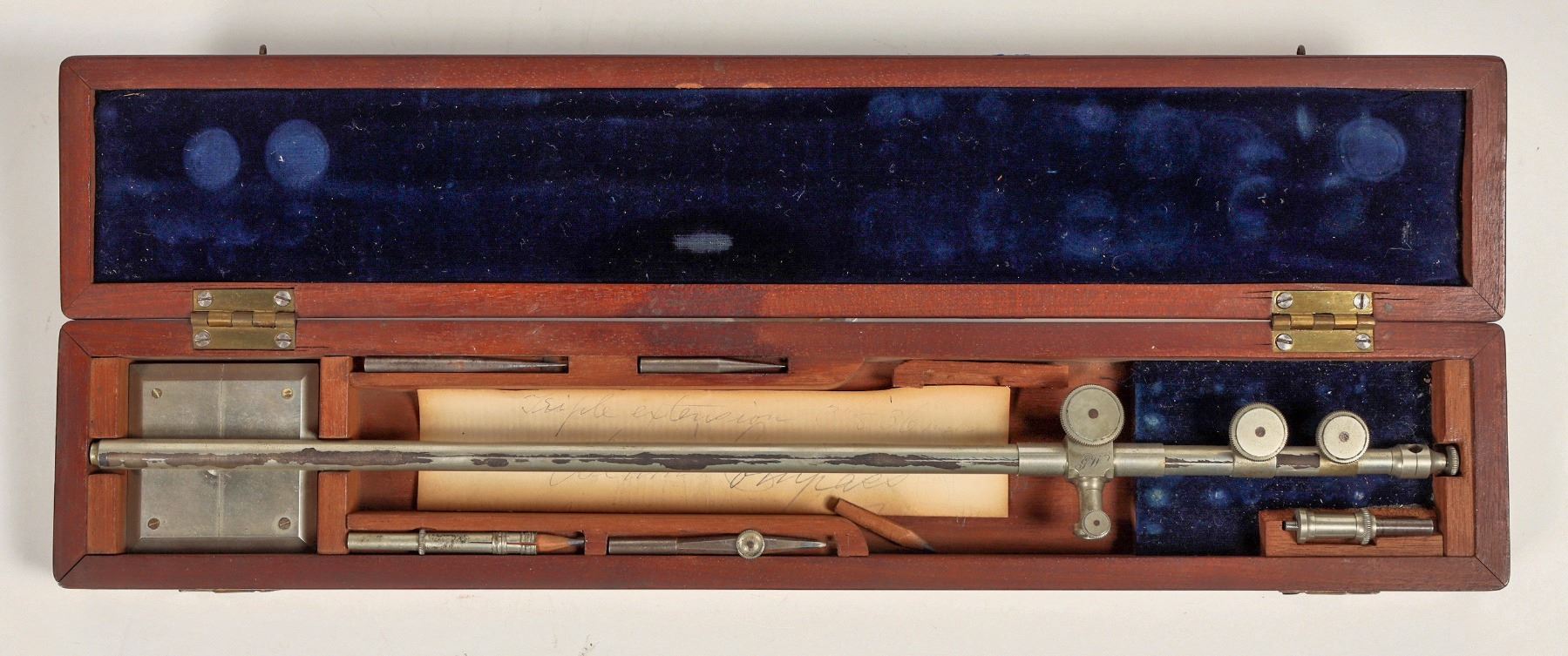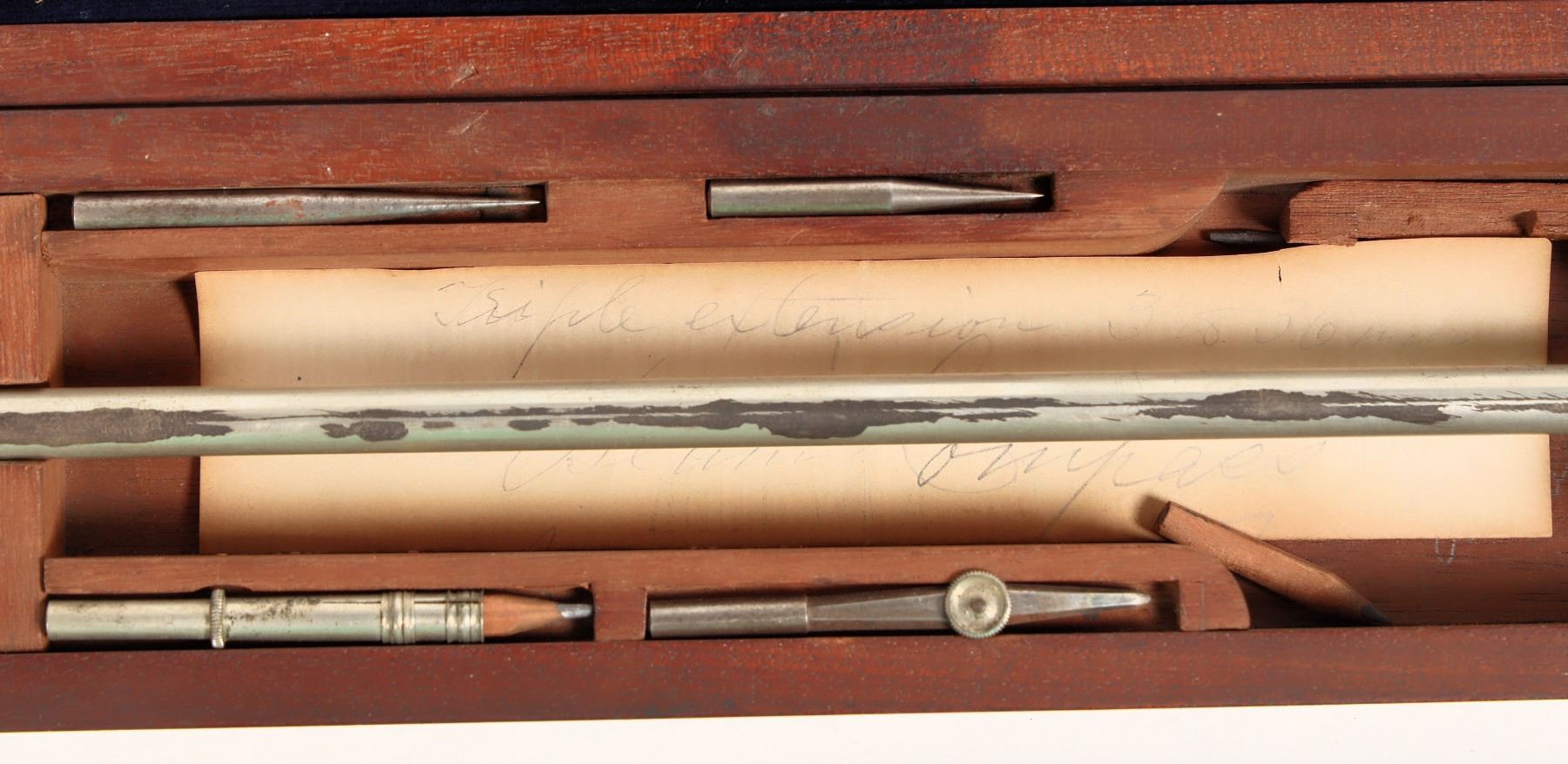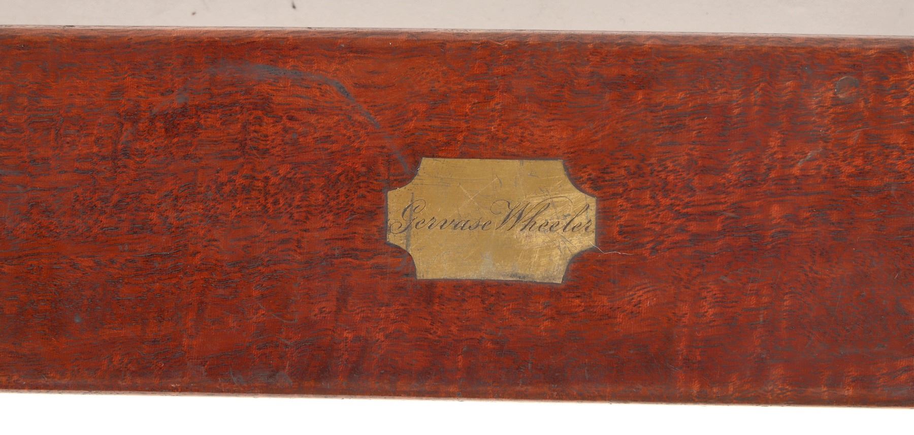 This beautifully cased drafting compass was made by Gervase Wheeler of London. Made around 1850 for drawing large scale building architecture or to-scale carpentry projects. One such tool was used to draw John. D. Rockefeller's home in 1850. it extends from 3 in. to 36 in. and is engraves "G.W." In a beautiful curly maple case. 14.5 in. display case. Please see photos for details.