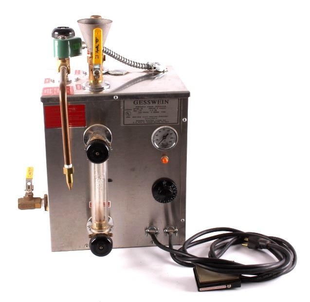 This is a Gesswein steam generator Model "JR". The generator was designed to clean fine jewelry. It uses 110v power. It is operated by the foot control which is included. The steam generator is in good condition. It measures 15" x 15" and is 20.5" tall.