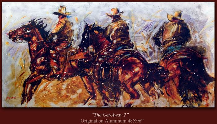 Get-Away captures three cowboys heading out of there as fast as they can ? Are they the good guys or the bad guys ? We don't know , but they sure can ride. "Get away" is a 20x40" handworked giclee on canvas , numbered 1/1 Unique.