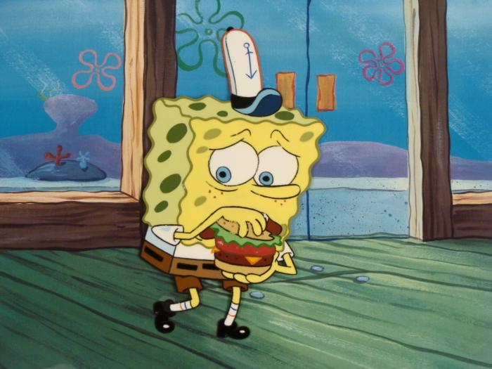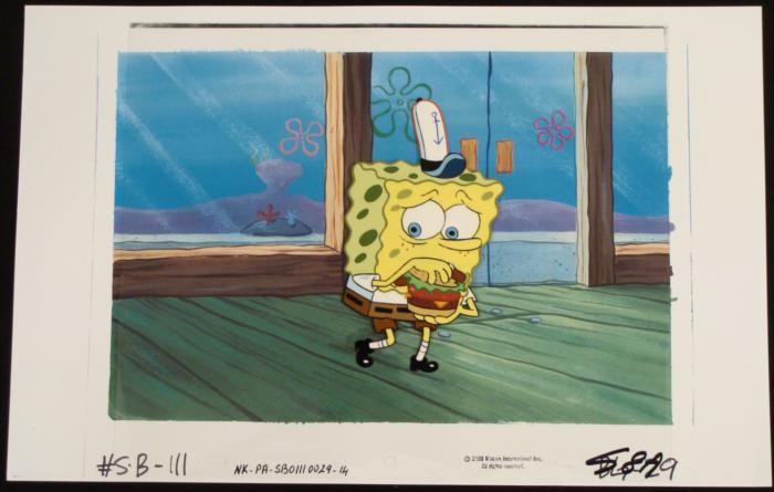 This animation cel and reproduction background are from the Nickelodeon TV show SpongeBob Squarepants. The story takes place under the deep blue sea in Bikini Bottom, where SpongeBob resides. SpongeBob, who is a yellow, porous sponge, is your typical happy-go-lucky character, as he is always cheerful and enjoys making people laugh. Patrick Star, SpongeBob's neighbor who is a starfish, is your average children's show idiot, as he boasts knowing nothing and is often getting himself into ridiculous situations. Between the homes of these two lies the home of the miserable Squidward, a squid, who is known for being grouchy and playing tricks on SpongeBob and Patrick. Both SpongeBob and Squidward work at the Krusty Krab, a fast food business run by the greedy money-loving Mr. Krabs, a crab, the arch rival of the evil, possibly misunderstood, Plankton. Another neighbor, Sandy Cheeks, an athletic squirrel who normally wears an astronaut's space suit, was introduced in "Tea at the Treedome." She spends most of her time inventing and experimenting. Crap! I'm so going to get caught...Original Printed Background and Animated Cel Overall Size of Background: 11" x 17" Overall Size of the Cel: 10 1/2" x 12 1/2" Very good condition This is an original hand-painted cel set-up used in the production of an episode of "SpongeBob SquarePants." Each one-of-a-kind set-up represents a slight change in position of the characters. When individually photographed and projected in rapid succession, the images appear to move.