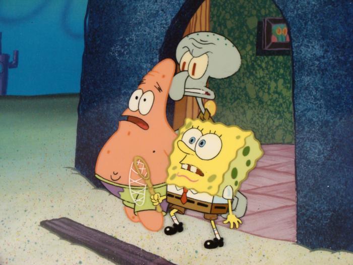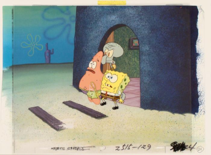 This animation cel and reproduction background are from the Nickelodeon TV show SpongeBob Squarepants. The story takes place under the deep blue sea in Bikini Bottom, where SpongeBob resides. SpongeBob, who is a yellow, porous sponge, is your typical happy-go-lucky character, as he is always cheerful and enjoys making people laugh. Patrick Star, SpongeBob's neighbor who is a starfish, is your average children's show idiot, as he boasts knowing nothing and is often getting himself into ridiculous situations. Between the homes of these two lies the home of the miserable Squidward, a squid, who is known for being grouchy and playing tricks on SpongeBob and Patrick. Both SpongeBob and Squidward work at the Krusty Krab, a fast food business run by the greedy money-loving Mr. Krabs, a crab, the arch rival of the evil, possibly misunderstood, Plankton. Another neighbor, Sandy Cheeks, an athletic squirrel who normally wears an astronaut's space suit, was introduced in "Tea at the Treedome." She spends most of her time inventing and experimenting. Get out of my house.Original Printed Background and Animated Cel Overall Size of Background: 11" x 17" Overall Size of the Cel: 10 1/2" x 12 1/2" Very good condition This is an original hand-painted cel set-up used in the production of an episode of "SpongeBob SquarePants." Each one-of-a-kind set-up represents a slight change in position of the characters. When individually photographed and projected in rapid succession, the images appear to move.