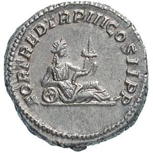 Roman Empire Coins. Geta (209-212). Denarius. D/ P SEPT GETA PIVS AVG BRIT. Testa laureata a destra. R/ FORT RED TR P III COS II PP. La Fortuna, semisdraiata a destra, tiene una cornucopia. RIC 77. gr. 3.17 AG. qFDC. Esemplare di qualit eccezionale, con delicata patina di monetiere su fondi lucenti.