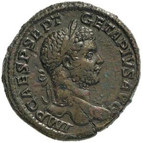 Impero Romano. Geta (209,212). Sesterzio. D/ Busto laureato a destra. R/ PONTIF TR P II COS II SC. Geta e Caracalla sacrificano su altare acceso, dietro, Severo stante di fronte. RIC 156a. gr. 20.39 RR. AE. Bella patina cuoio. BB+/BB.