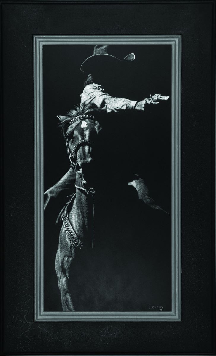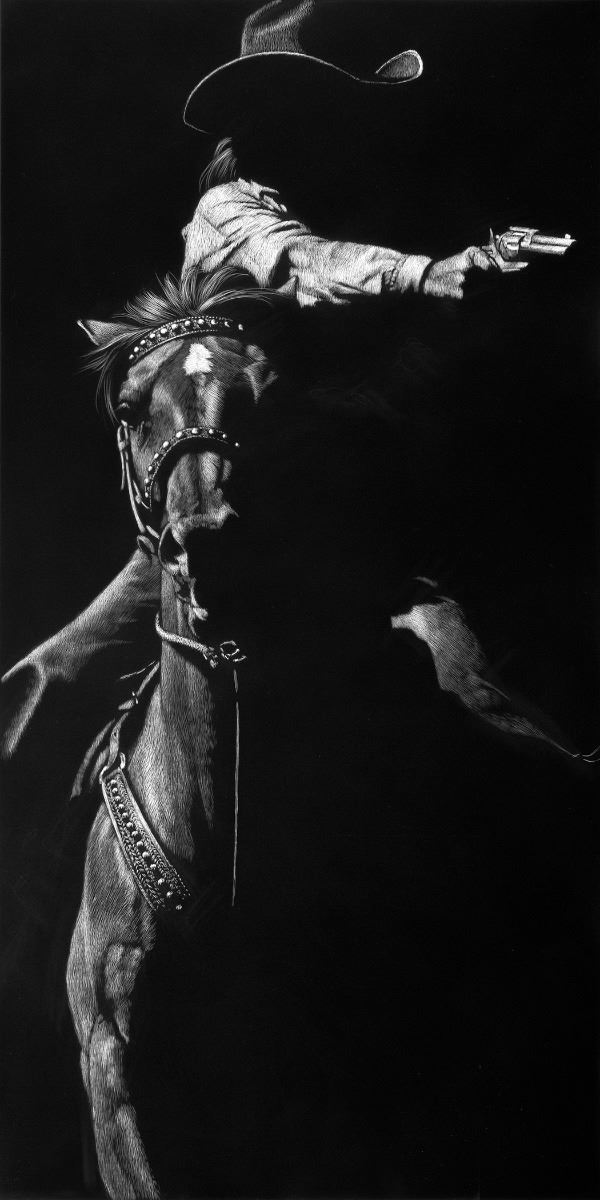 Artist: Julie T. Chapman. Title: Getaway Vehicle #1. Medium: Scratchboard. Size: 20" x 10". Framed size (if applicable): 27" x 17" Artist's description: I find artistic inspiration in many animal species, but horses are near and dear to my heart; they were my first love artistically, and I also deeply enjoy dressage, eventing, and other equestrian pursuits. Cowboy mounted shooting is tremendous fun to watch (and no doubt to ride), and the compositional possibilities the sport offers are tremendous. (The horses wear large soft earplugs to protect against the noise of the pistol). Here, a cowgirl fires across her saddle while charging straight at us. Shipping from ZIP CODE 59846.