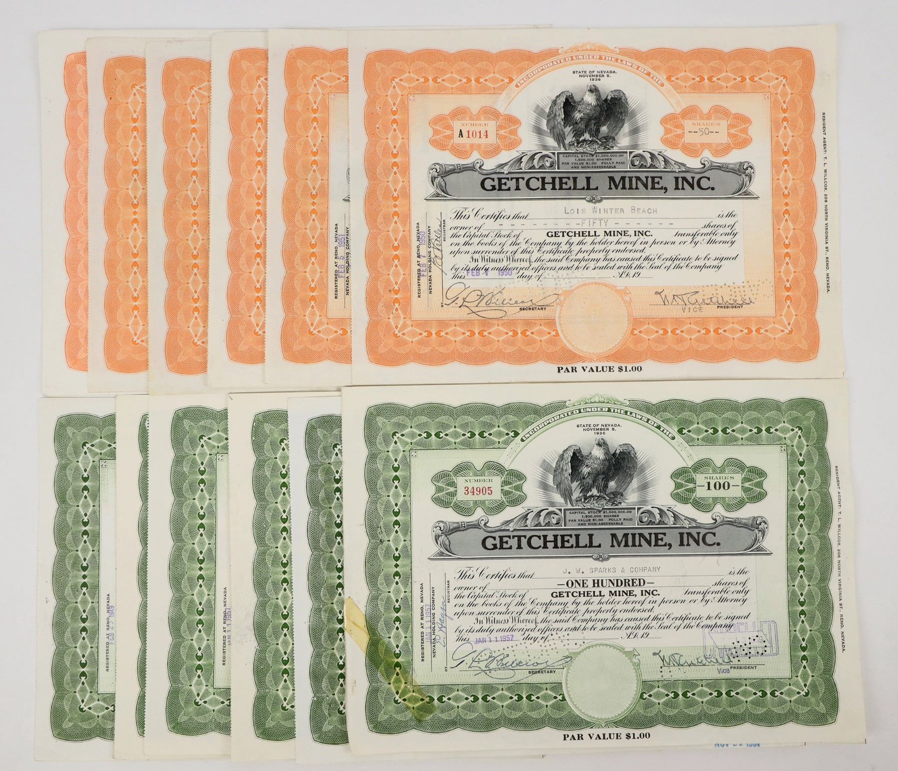 Lot of 17. I/U, I/C. Issued 1950-59. Fine or better. Getchell Mine, Inc.. Two varieties, cancel by stamp. Located in Potosi Mining Dist., Humboldt County, Nevada. Signed by Noble Getchell V.P.